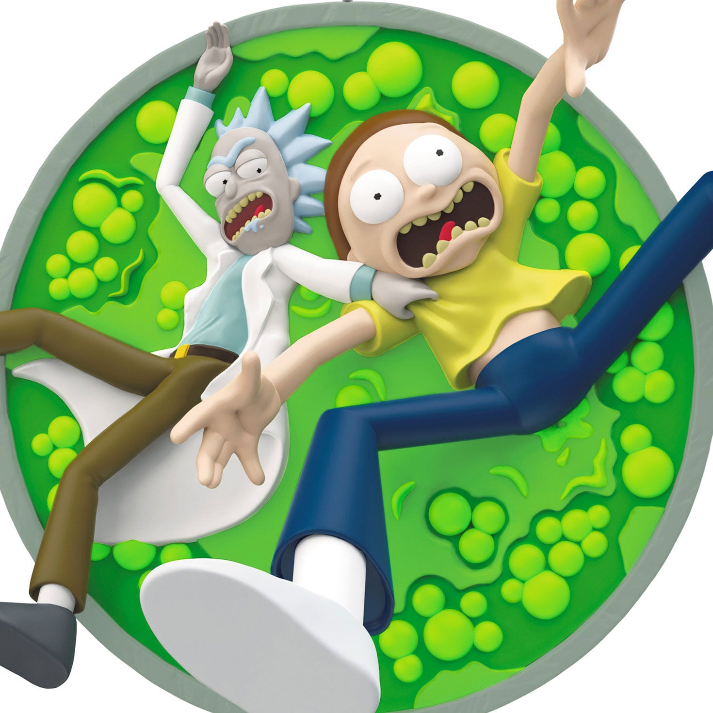 Oh, geez! If ever there was a sign of interdimensional shenanigans, it’s an appearance of anxious teen Morty Smith and his scientist grandpa Rick Sanchez. Fans of the acclaimed animated sitcom "Rick and Morty" won't be able to resist this Christmas tree ornament featuring the pair jumping into a vat of fake acid from an iconic episode in the show's fourth season.