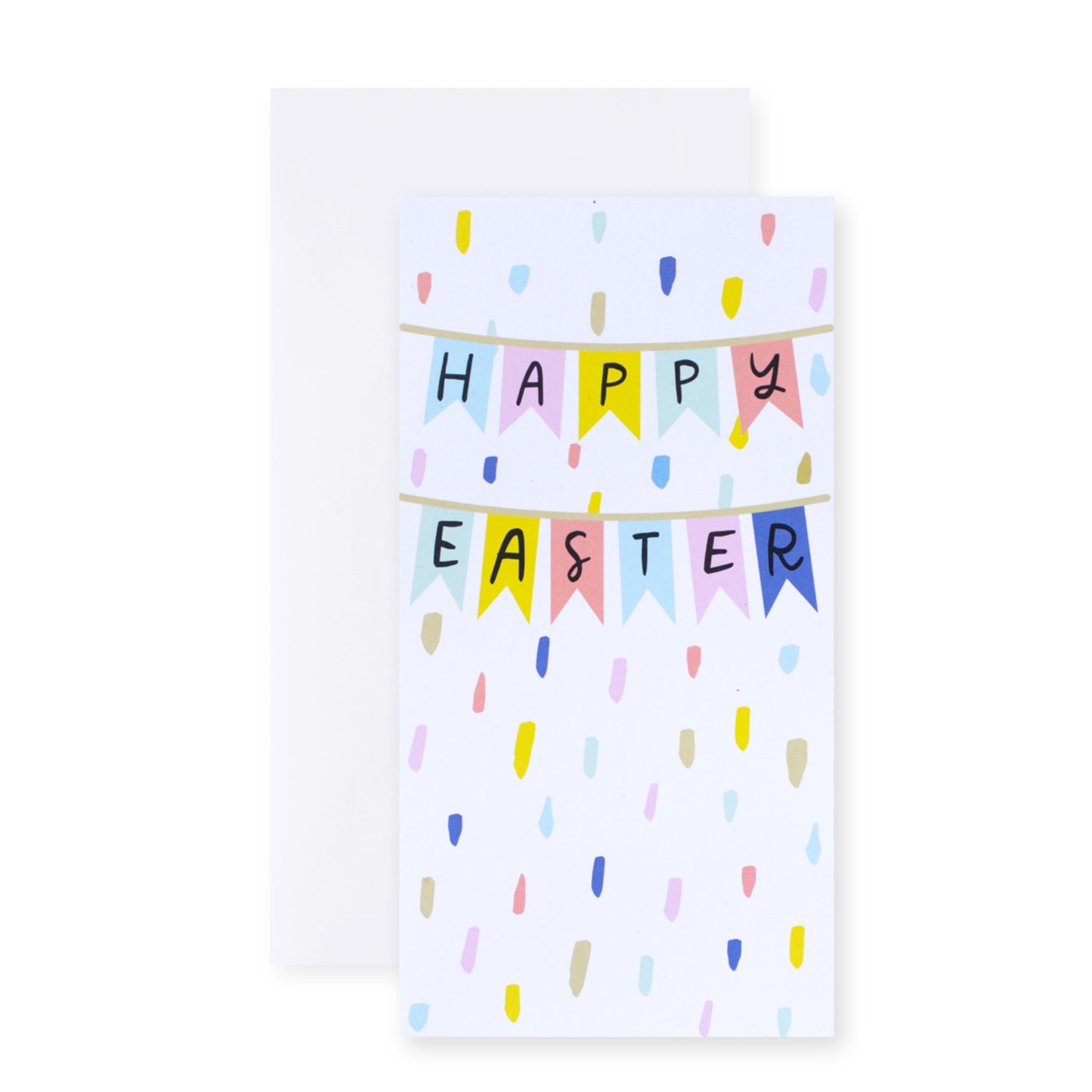 The front of this card features a pastel bunting design with the message 'Happy Easter' Blank inside for your personal message. Care for your people. Care for your planet. This product is made of material from well-managed, FSC®-certified forests and other controlled sources.