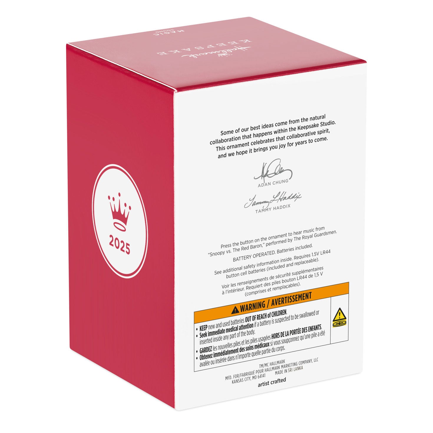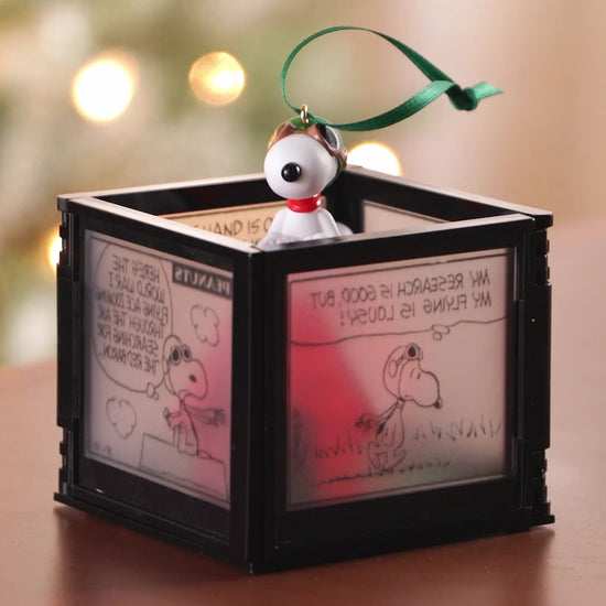 Bring adventure to the holidays and celebrate the 75th anniversary of the Peanuts with this fun Christmas tree ornament. Dressed in aviator goggles and a scarf as his alter ego The Flying Ace, Snoopy is perched atop his imaginary airplane (aka his iconic red doghouse) against a backdrop of classic Peanuts comic strip panels. Press the button to hear music from the song "Snoopy vs. The Red Baron."