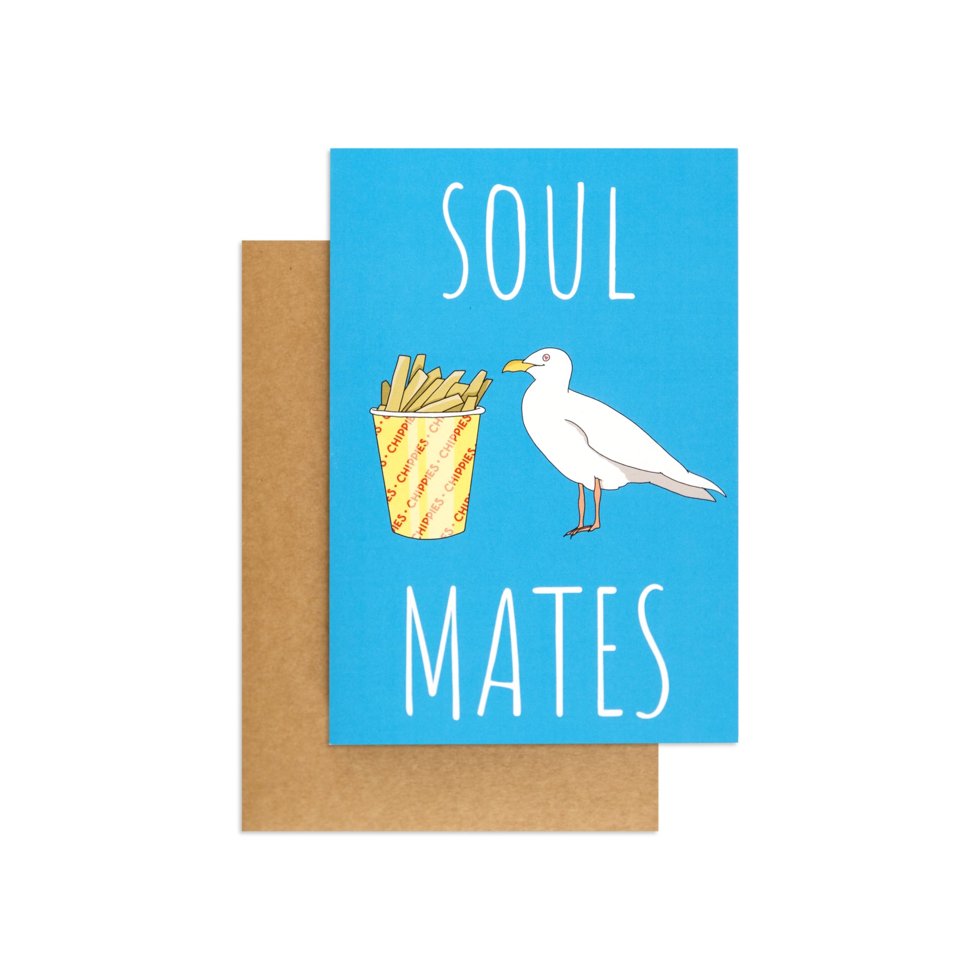 The front of the card features an illustration of a seagull next to a bucket of hot chips.