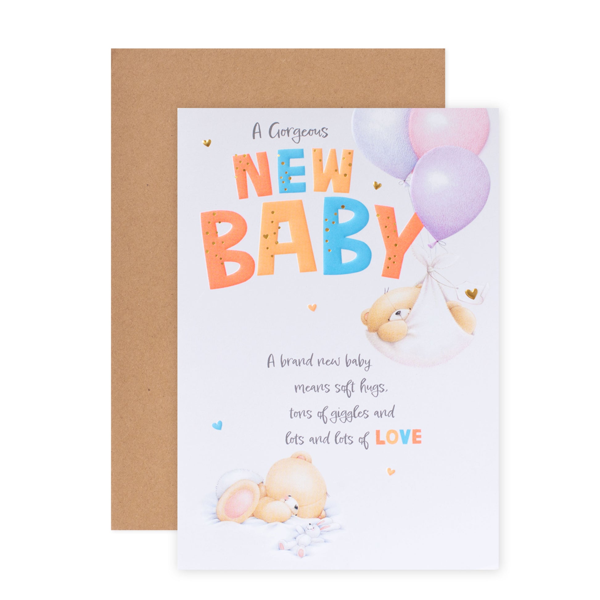 The front of the card features embossed elements, gold foil highlights, an illustration of baby Forever Friends bears, and the message “A gorgeous NEW BABY A brand new baby means soft hugs, tons of giggles and lots and lots of LOVE” The inside of the card features illustrations of a Forever Friends bear and a bunny rabbit alongside the message “The warmest welcome to your ADORABLE baby and biggest congratulations to you too… …wishing you a lifetime of FUN adventures filled with happiness! Enjoy Every Moment x” Includes one card and one coordinating kraft Hallmark branded envelope Care for your people. Care for your planet. This product is made of material from well-managed, FSC®-certified forests and other controlled sources and is 100% recyclable