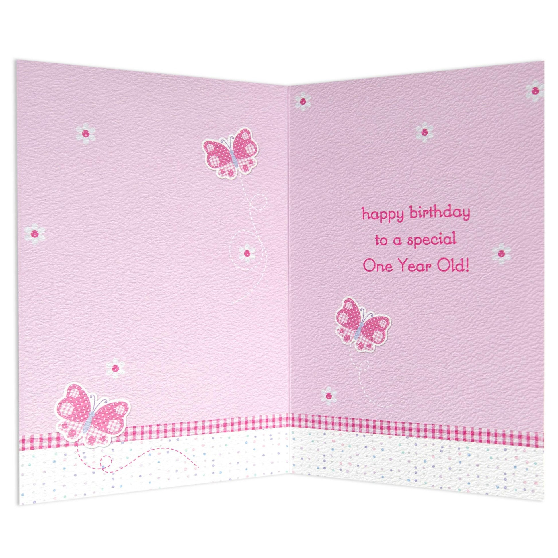 The front of the birthday card features mixed patterns, glitter highlights, pink stitched accents, and an illustration butterflies, flowers and the number 1 on textured card.