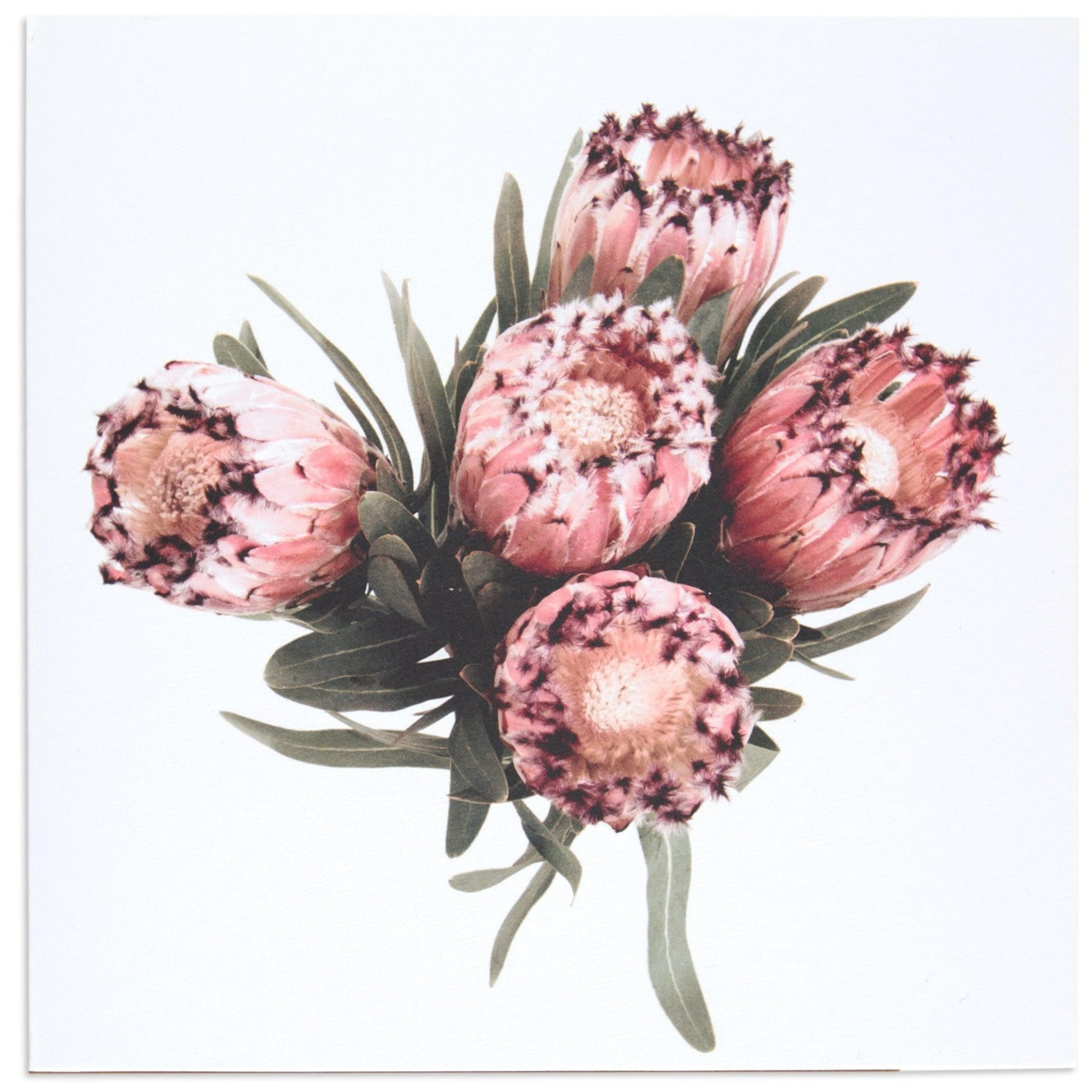 Features a stunning image of five proteas (sugarbushes) on a white background