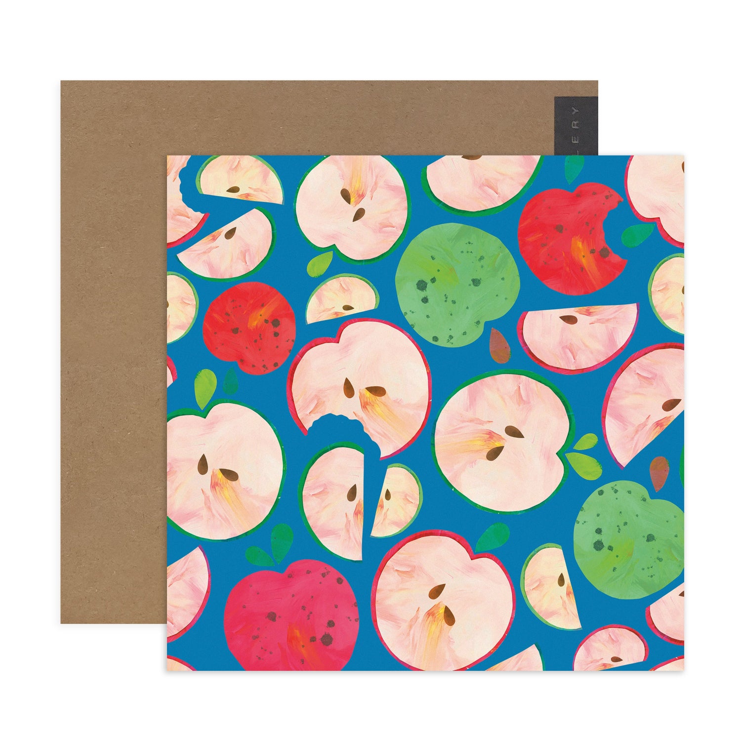 - The front of the card features an illustration by Australian artist Kasey Rainbow of red and green apples on a bright blue background