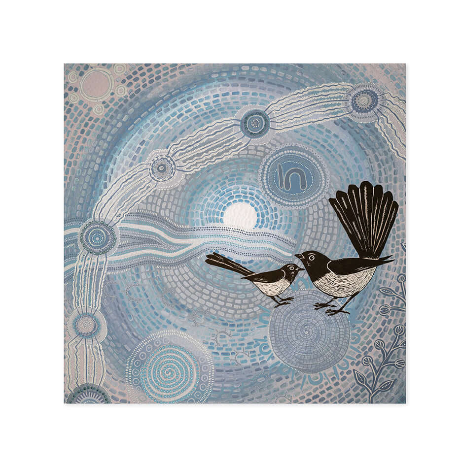 - The front of the card features a beautiful and vibrant artwork by Indigenous artist Emma Stenhouse of two willie wagtail birds on a background of soft blue shades