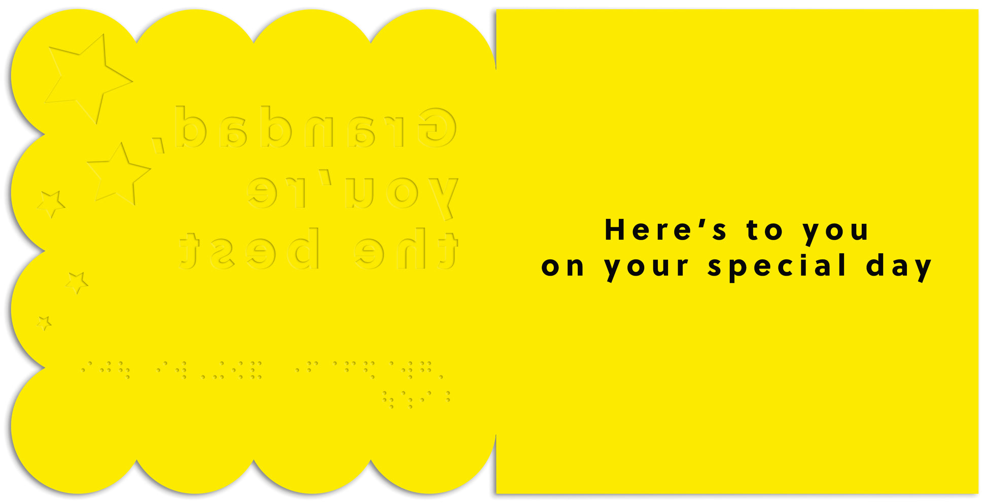 - The front of the card features the message 'Grandad, you're the best' embossed in braille and printed in high contrast bold white and yellow text on a dark background. It also features illustrations of yellow and white embossed stars and a scalloped shaped die-cut edge.