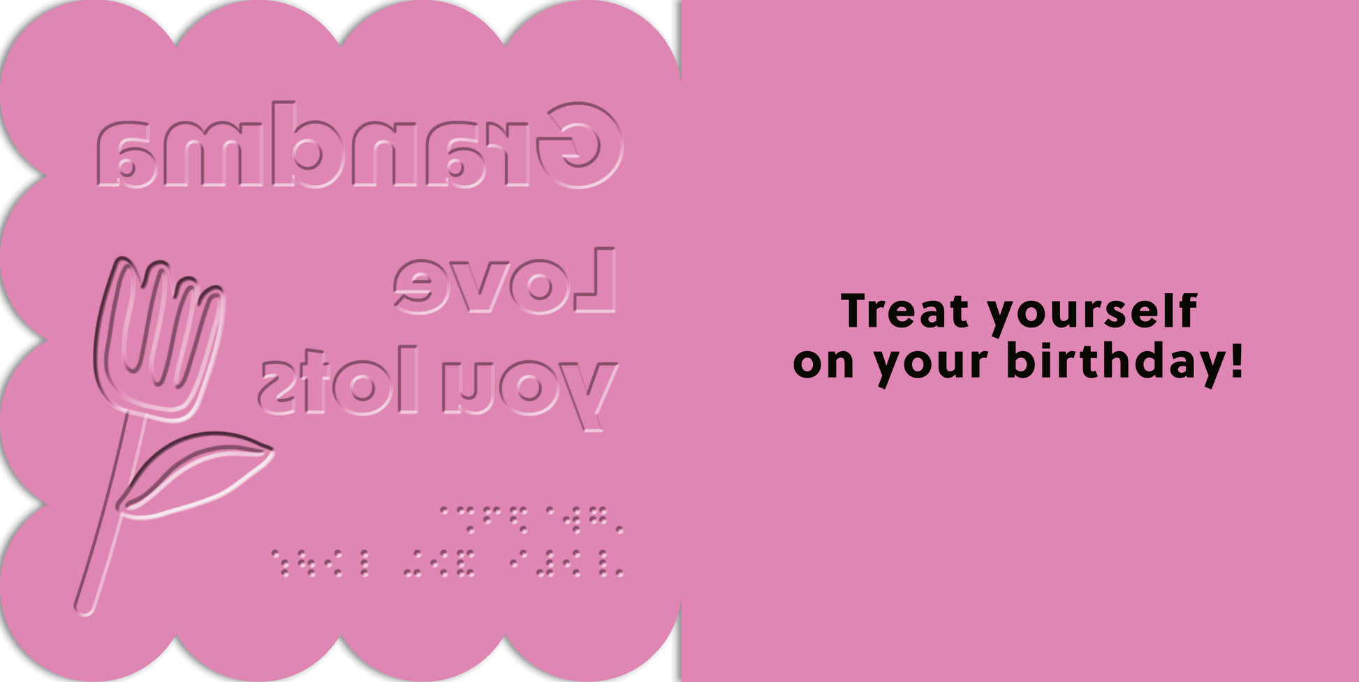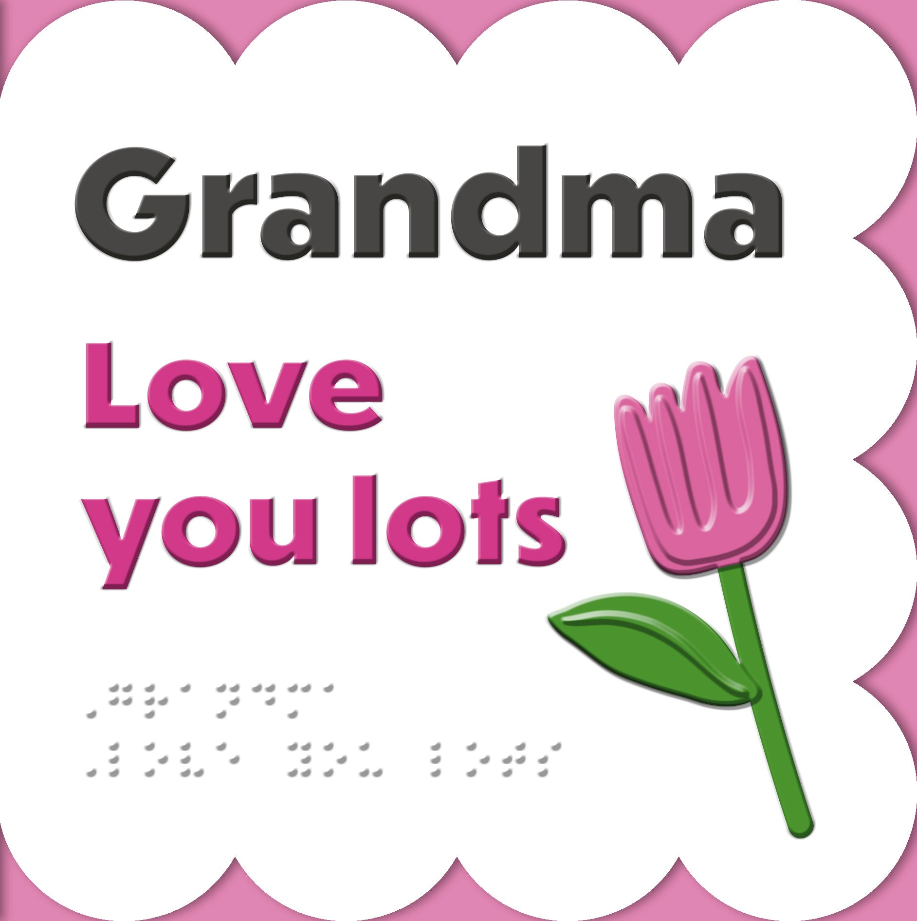 - The front of the card features the message 'Grandma Love you lots' embossed in braille and printed in high contrast bold black and pink text on a white background. It also features an illustration of pink embossed tulip and a scalloped shaped die-cut edge.