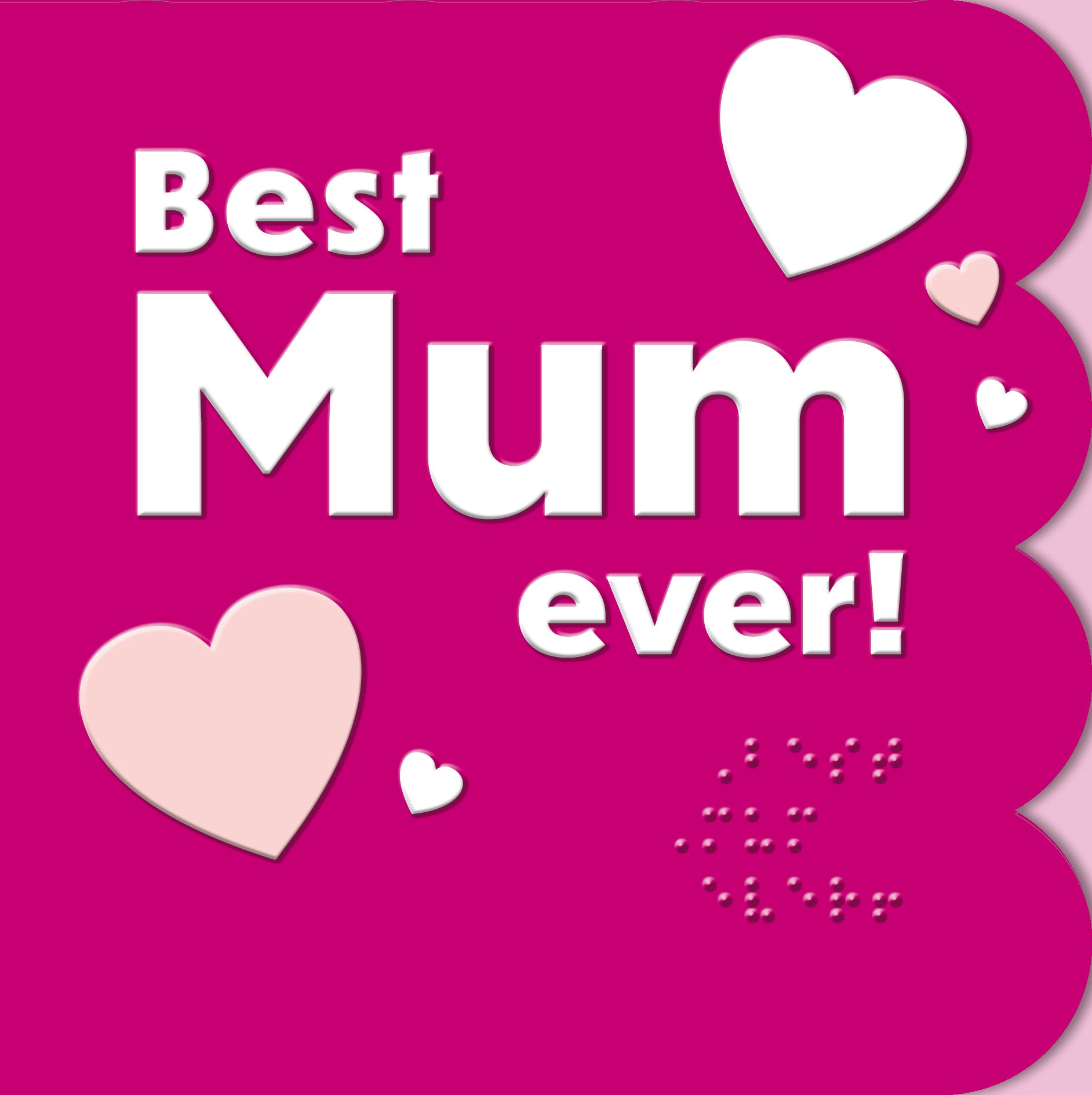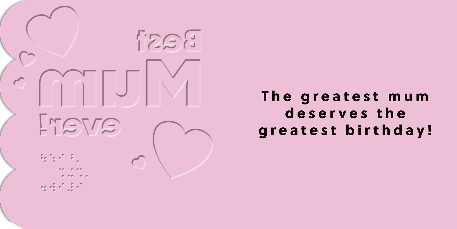 - The front of the card features the message 'Best mum ever!' embossed in braille and printed in high contrast bold white text on a bright fuschia pink background. It also features illustrations of white and pale pink embossed love hearts and a scalloped shaped die-cut edge.