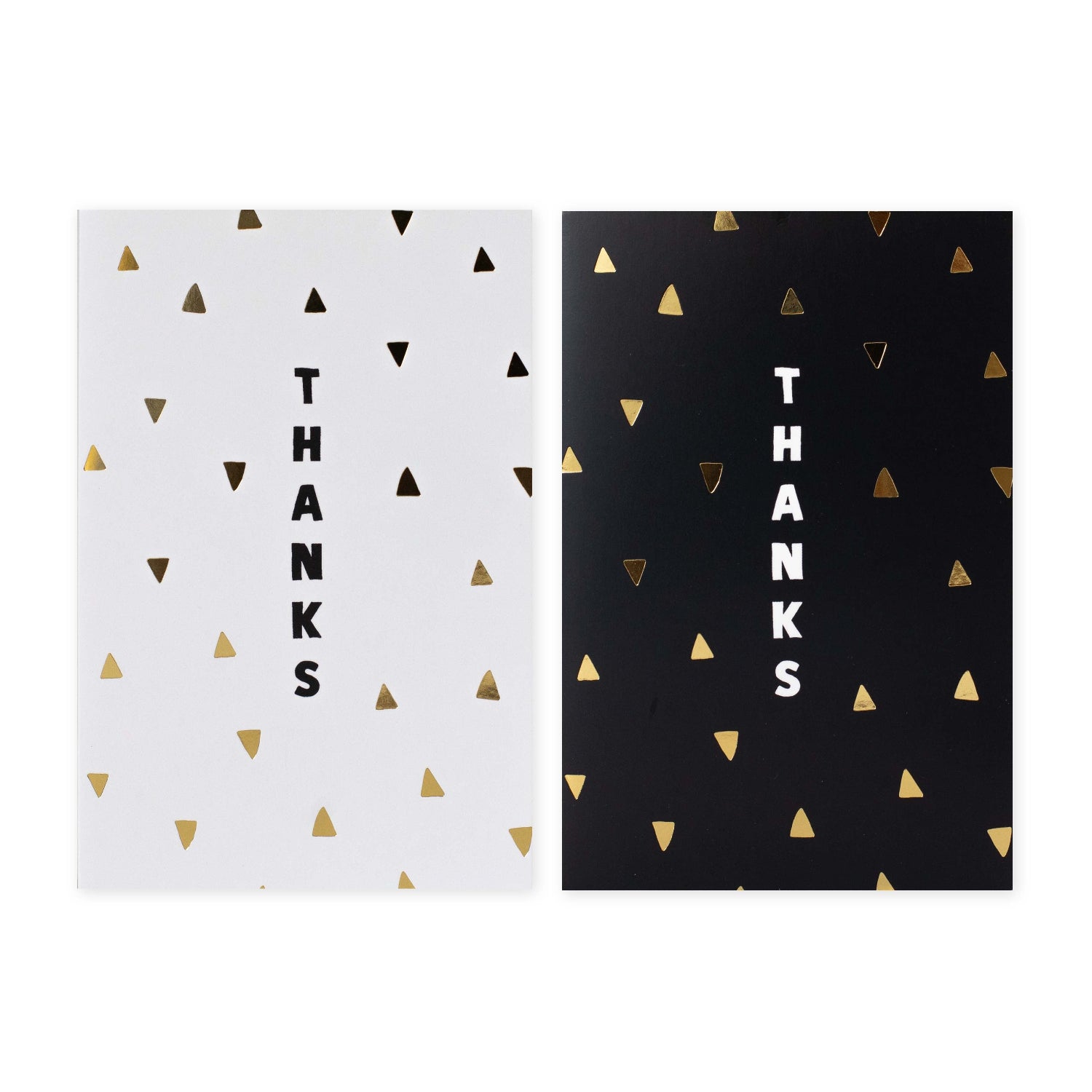 The front of design two features gold foil triangles on a white background with the message THANKS.