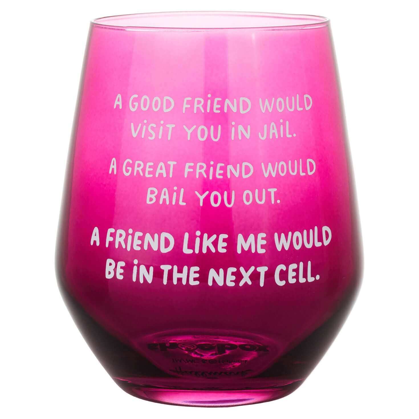 Find the perfect pairing (like you and your bestie) and then celebrate it with this funny wine glass from Hallmark Shoebox. Pink-tinted stemless glass in a dark pink-purple design features a humorous message about your friendship in white lettering along its contoured shape. Break out from the bars and go ham for your friendship with this hilarious drinking glass. Pair it with other funny stemless wine glasses, rocks glasses and coasters for barware that's outfitted to handle all the requirements of your friends and family with a shot of humour.