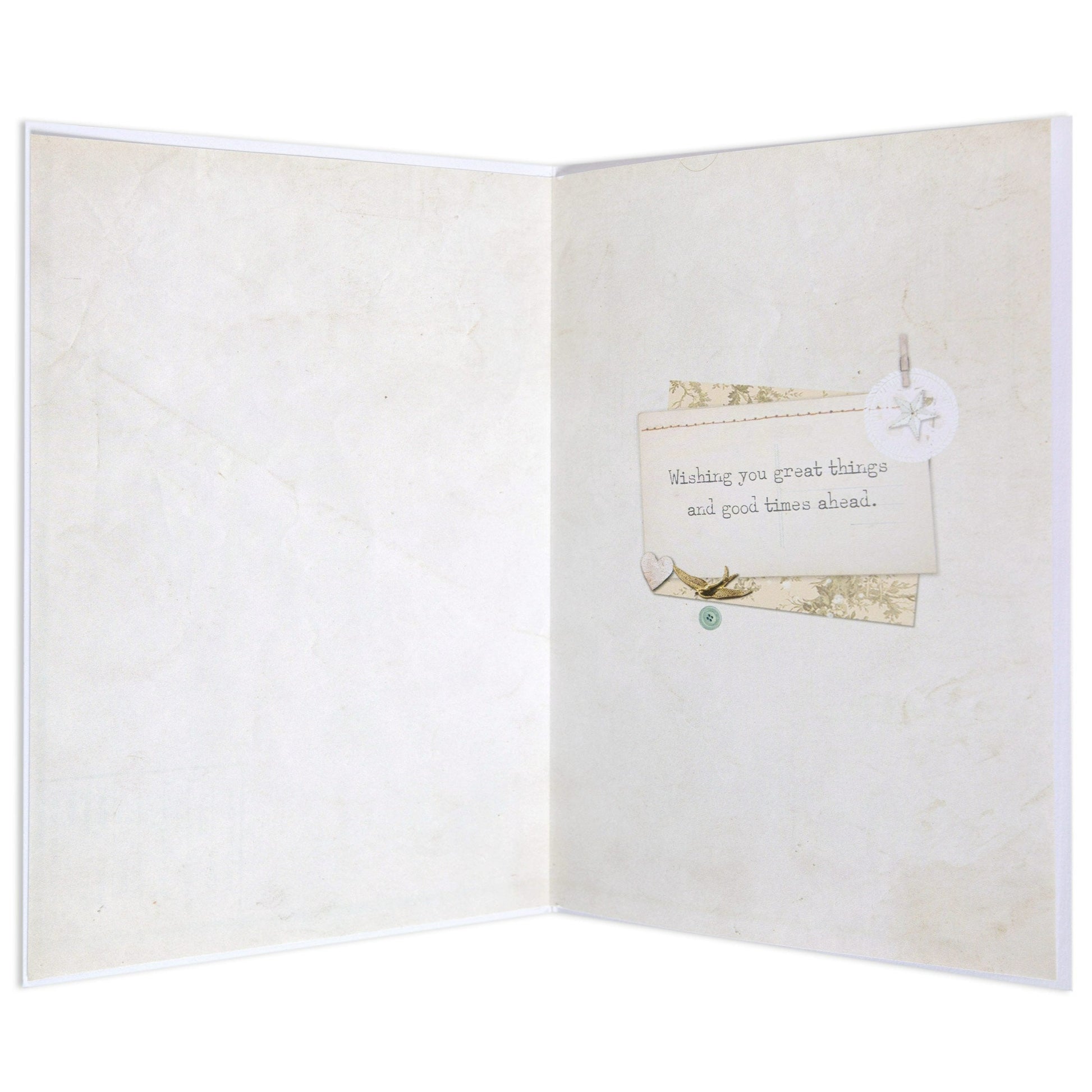 White with a marble style insert illustrated with a letter, button, starfish, and bird with the message: “Wishing you great things and good times ahead.”