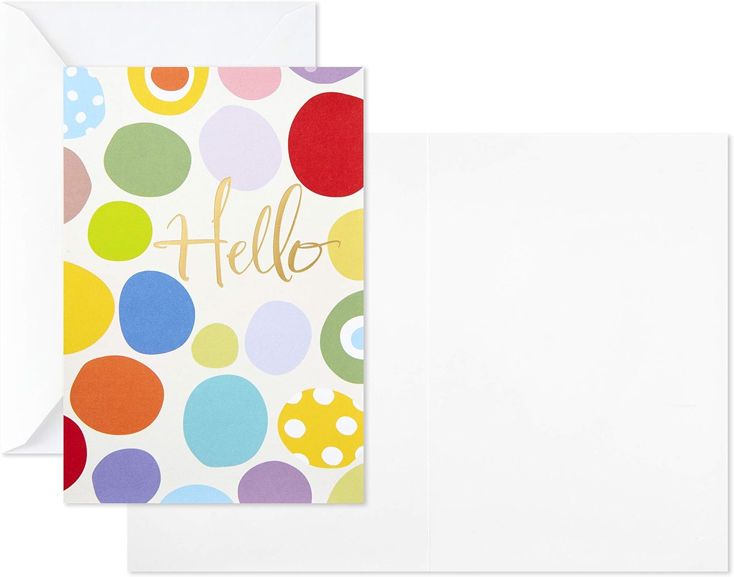 Perfect for any occasion, these cards feature four different designs: an ice cream cone with colorful scoops, aqua blue and white stripes with "Thinking of you" lettering, brightly colored dots with "Hello" lettering, and a whimsical vase with flowers.