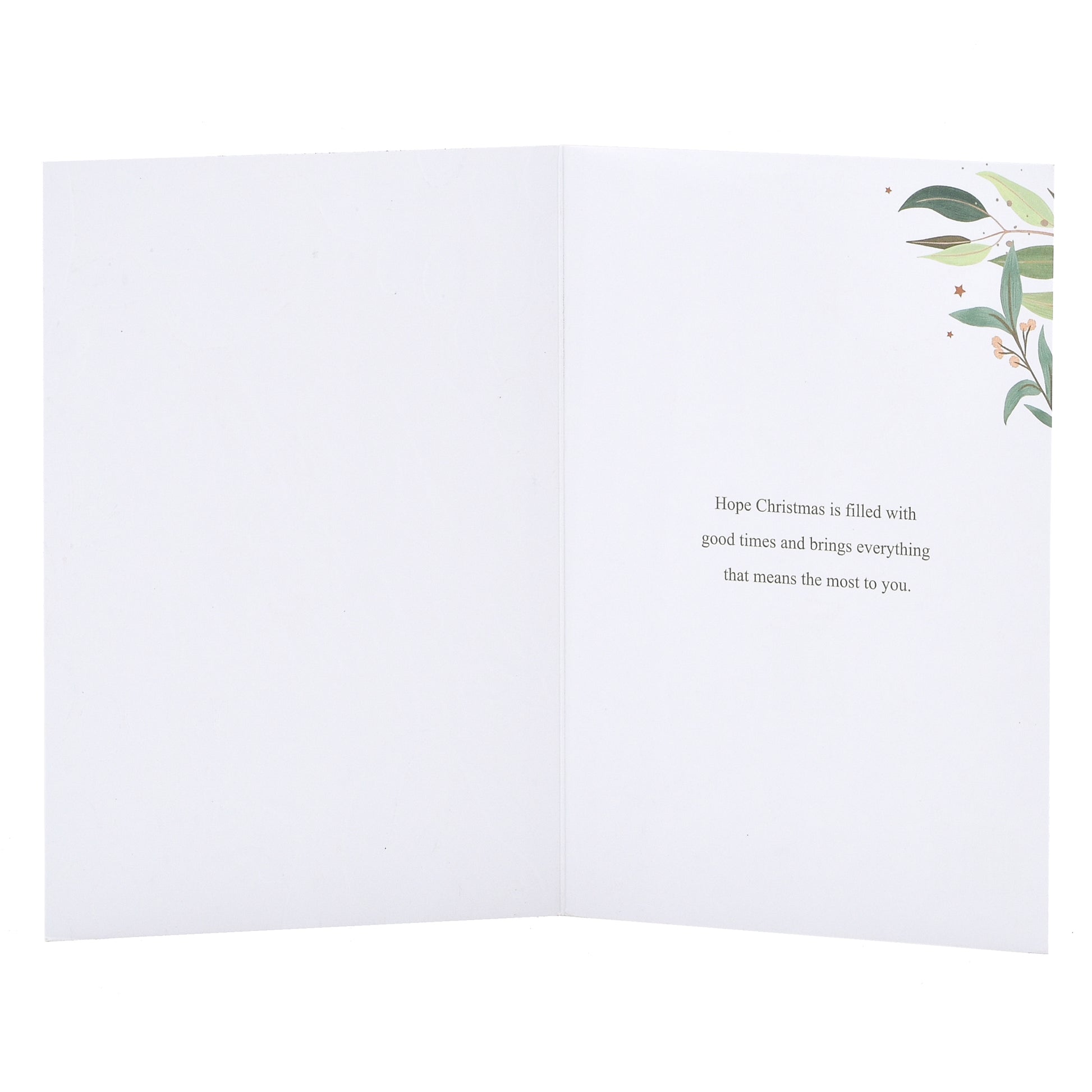 The front of the card features gold foil highlights, illustrations of branches of eucalyptus trees, and the message “Christmas Wishes” The inside of the card is illustrated with stars and branches of eucalyptus trees alongside the message “Hope Christmas is filled with good times and brings everything that means the most to you.” Printed using FSC paper from responsible sources Includes one coordinating illustrated red Hallmark branded envelope