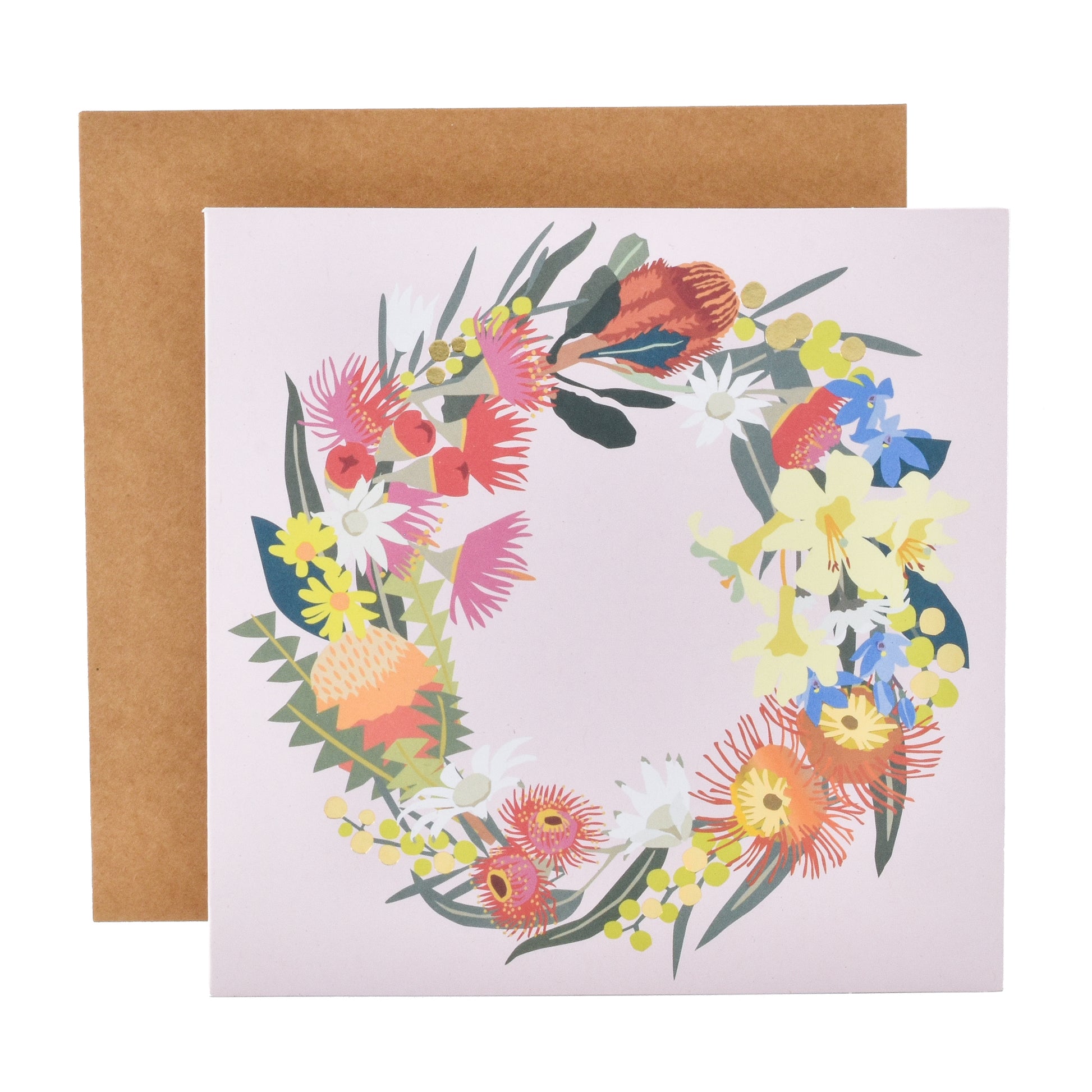 The front of the card features gold foil highlights and a colourful, contemporary floral illustration of a Christmas wreath made from Australian natives Blank inside for your own message Printed using FSC paper from responsible sources Designed by local artist Leah Bartholomew Made in Australia Includes one coordinating kraft Hallmark branded envelope.