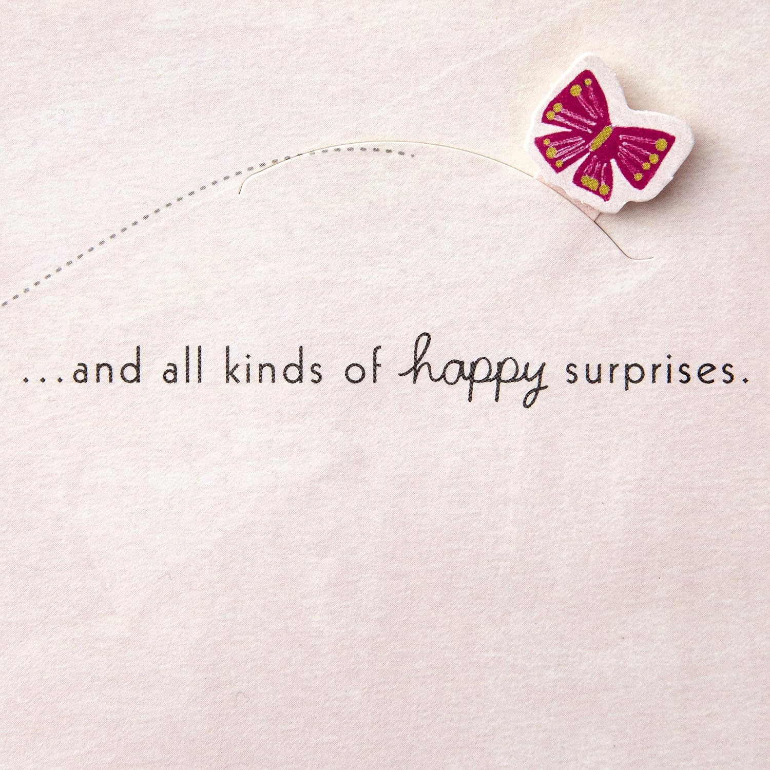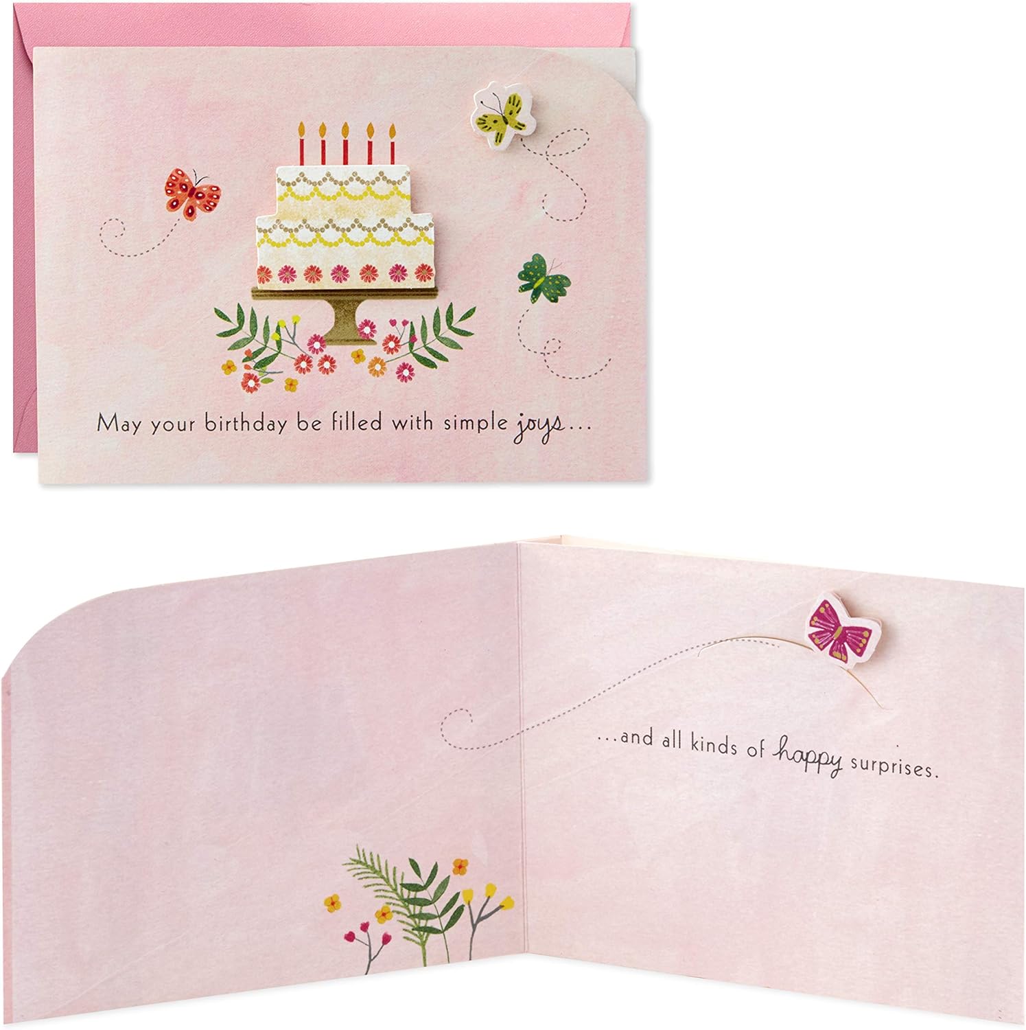 Cover features a lovely birthday cake on a pink background, embellished with paper attachments. Open the card to see a butterfly float across the sky. Inside reads: " . . . And all kinds of happy surprises."