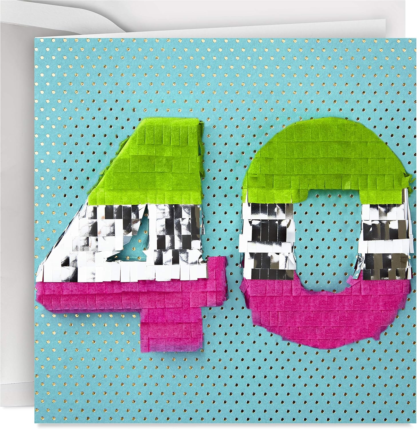 Cover features a 3D piñata of the number 40 on a light blue foil dotted background.