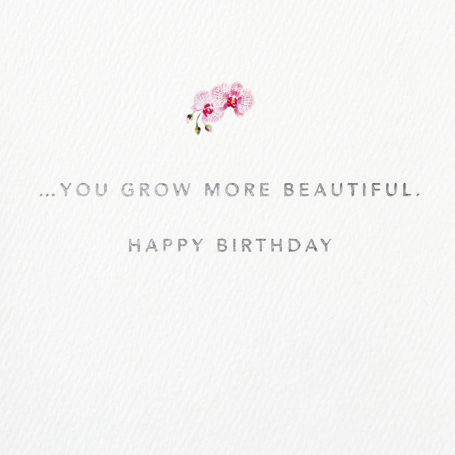 Cover features a lovely dimensional pink orchid design, accented with foil and pearls. Inside reads: "…You grow more beautiful. Happy birthday."