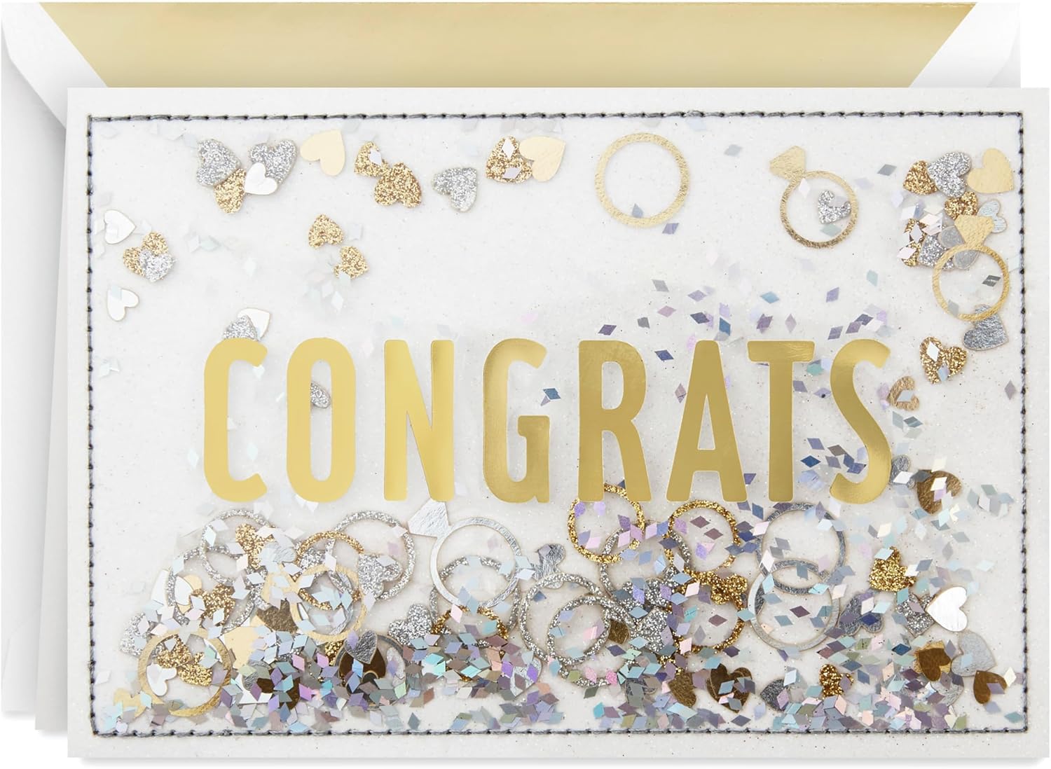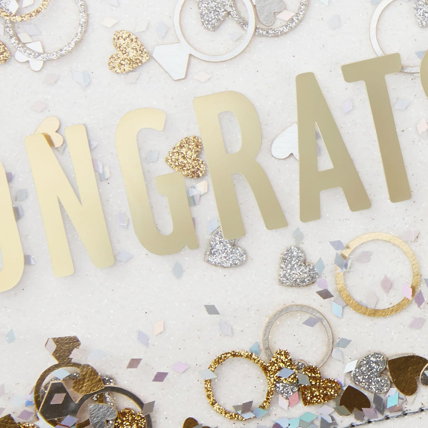 Fun card features a sealed clear overlay filled with free floating engagement ring and hearts confetti accented with glitter and foil Inside reads: "Wishing you a long, fun, and incredibly happy life together "