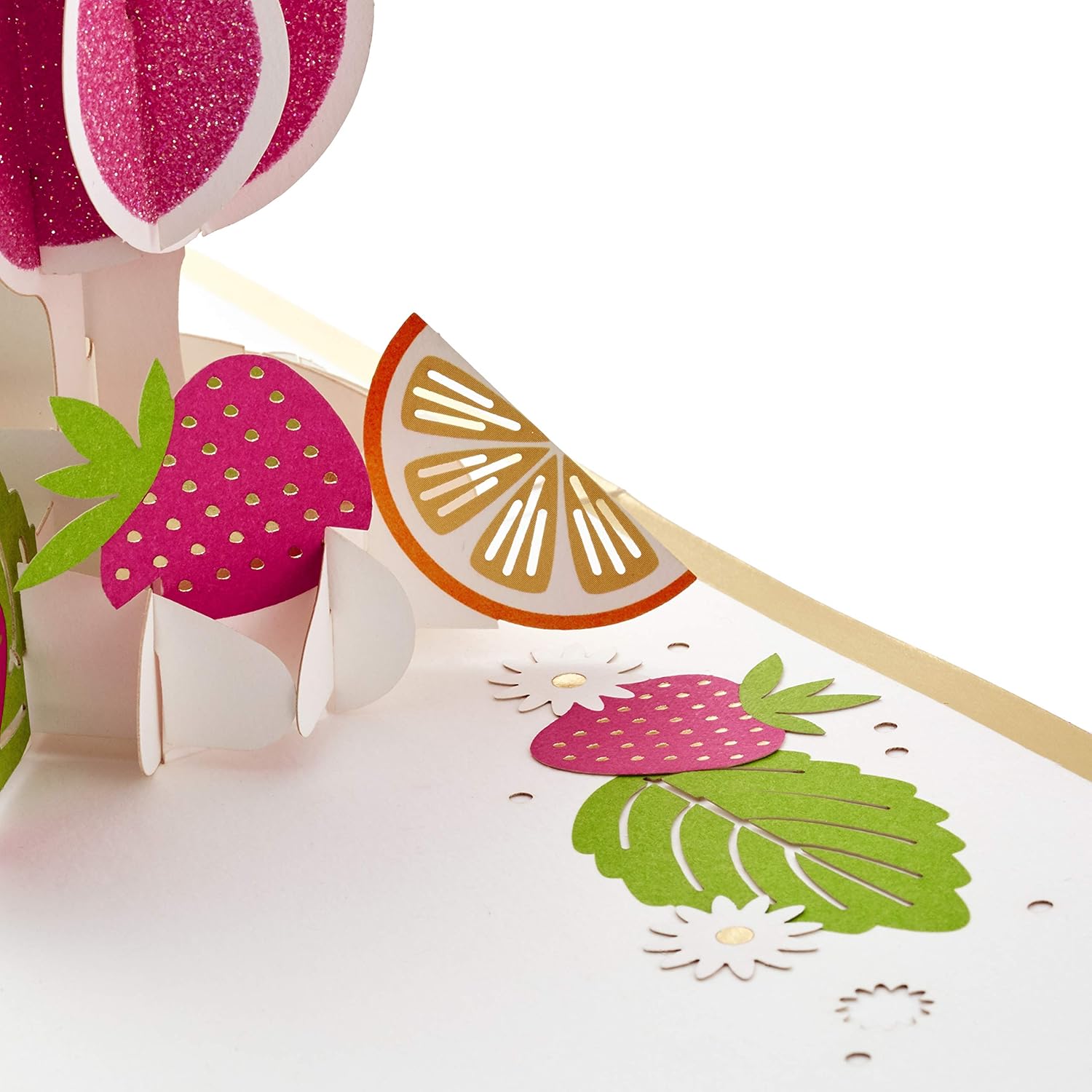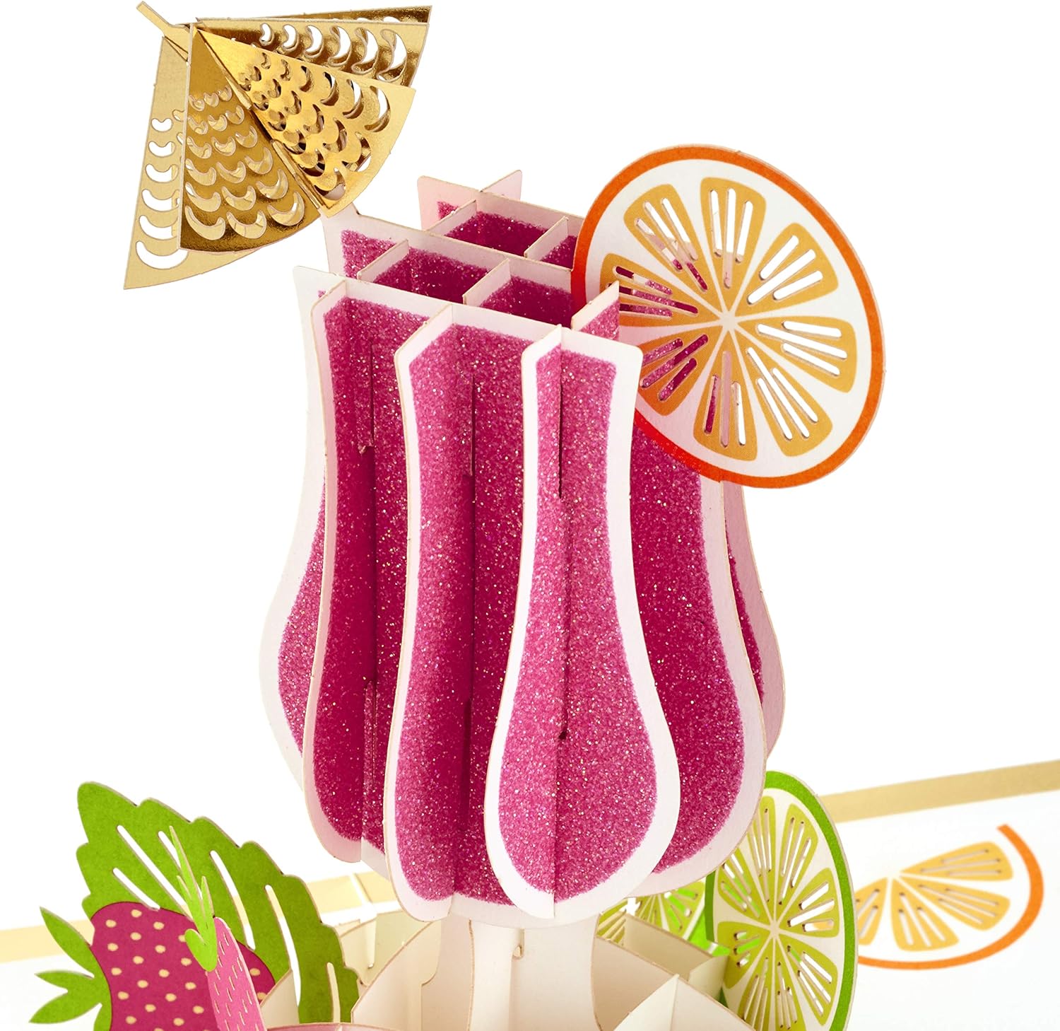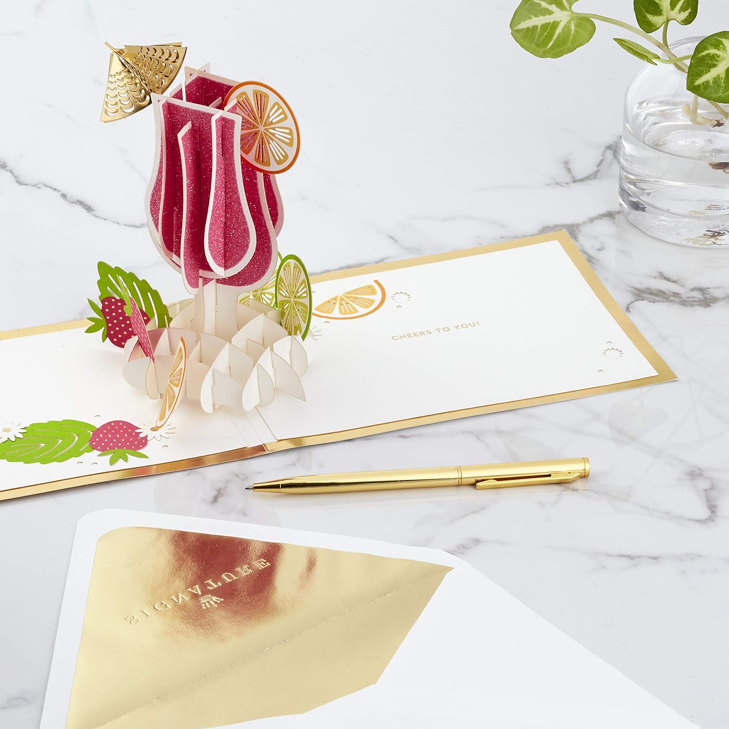 Pink cover features gold foil accents and lettering that reads, "Here's to you." Inside features an elaborate surprise pop-up of a tropical drink, complete with a teeny umbrella, and the message: "Cheers to You!".