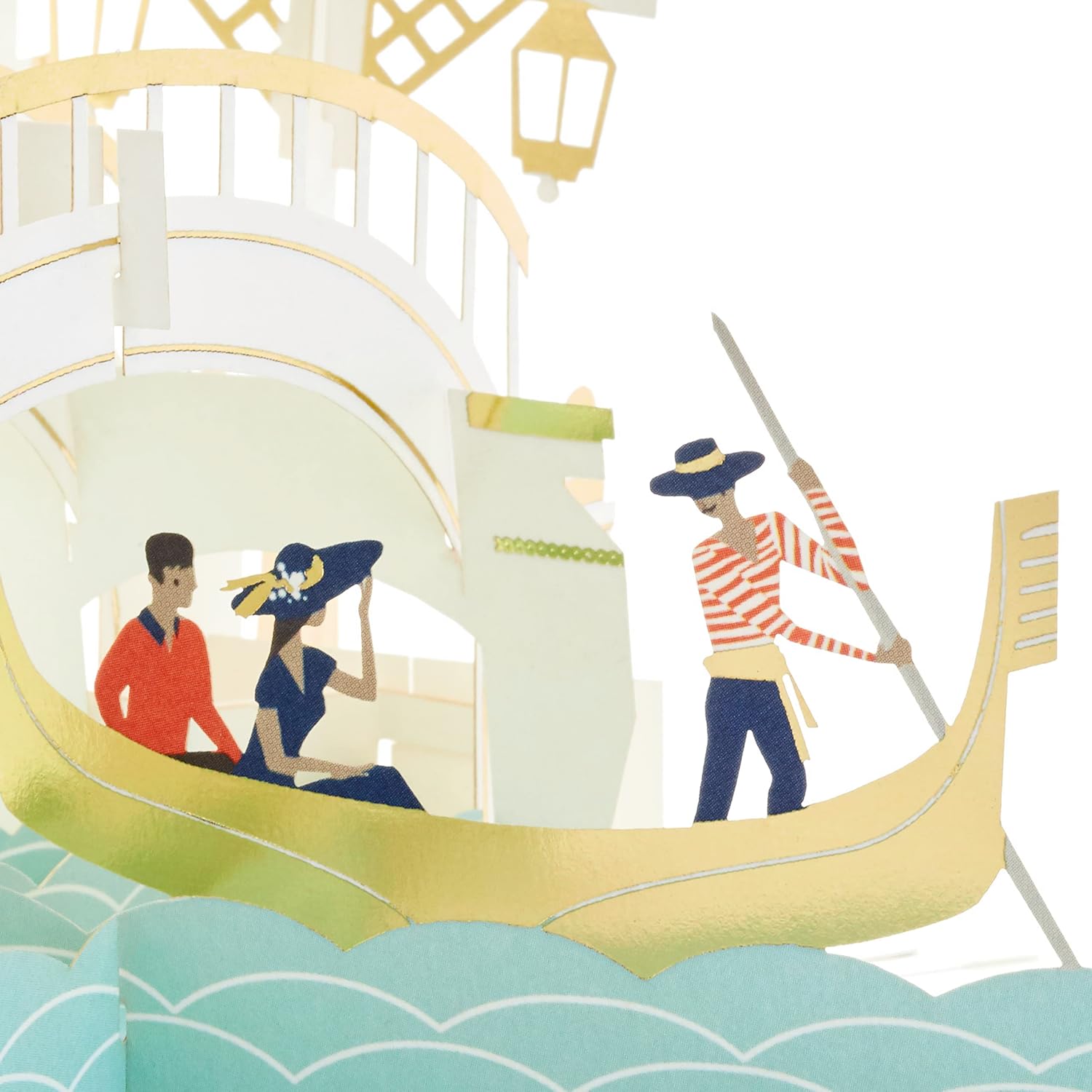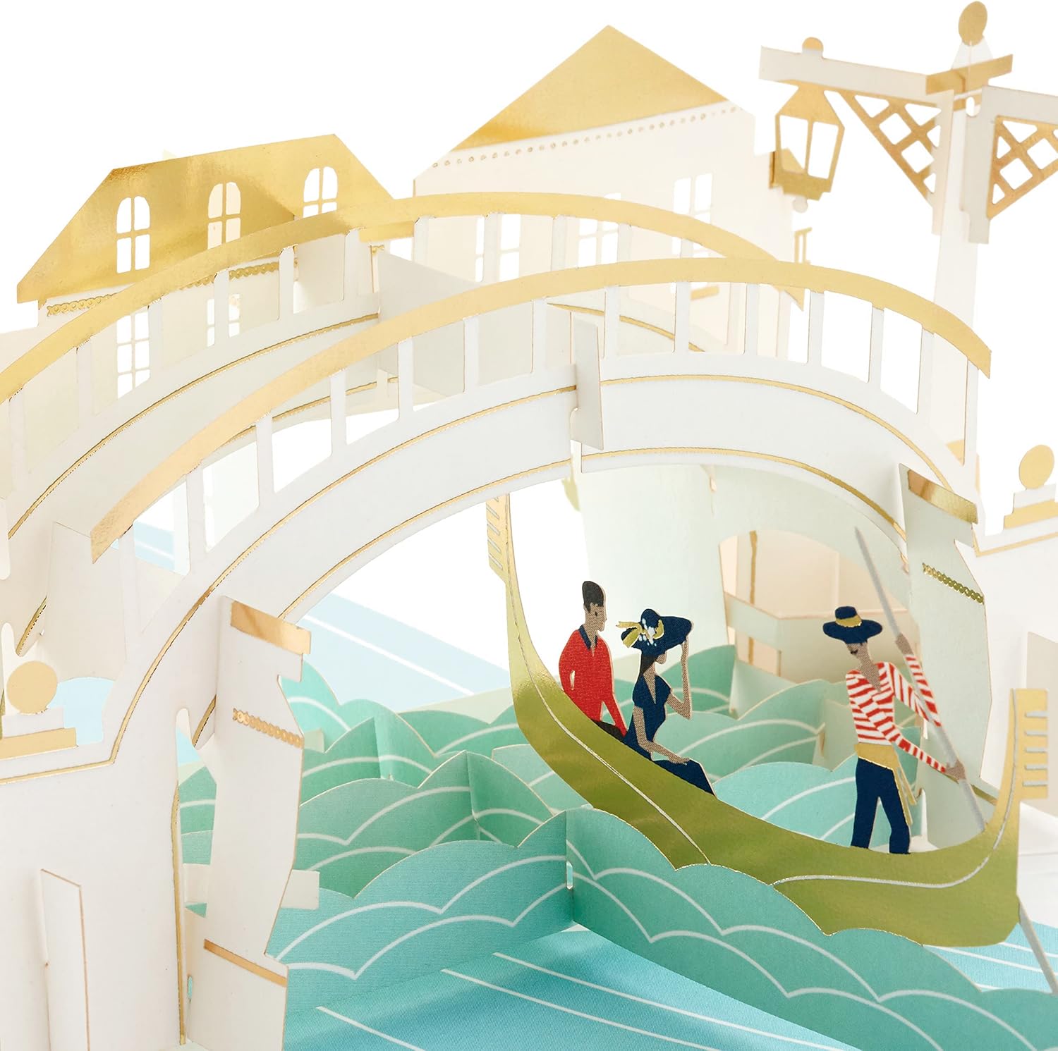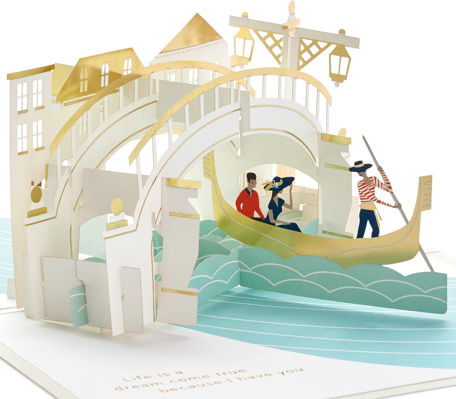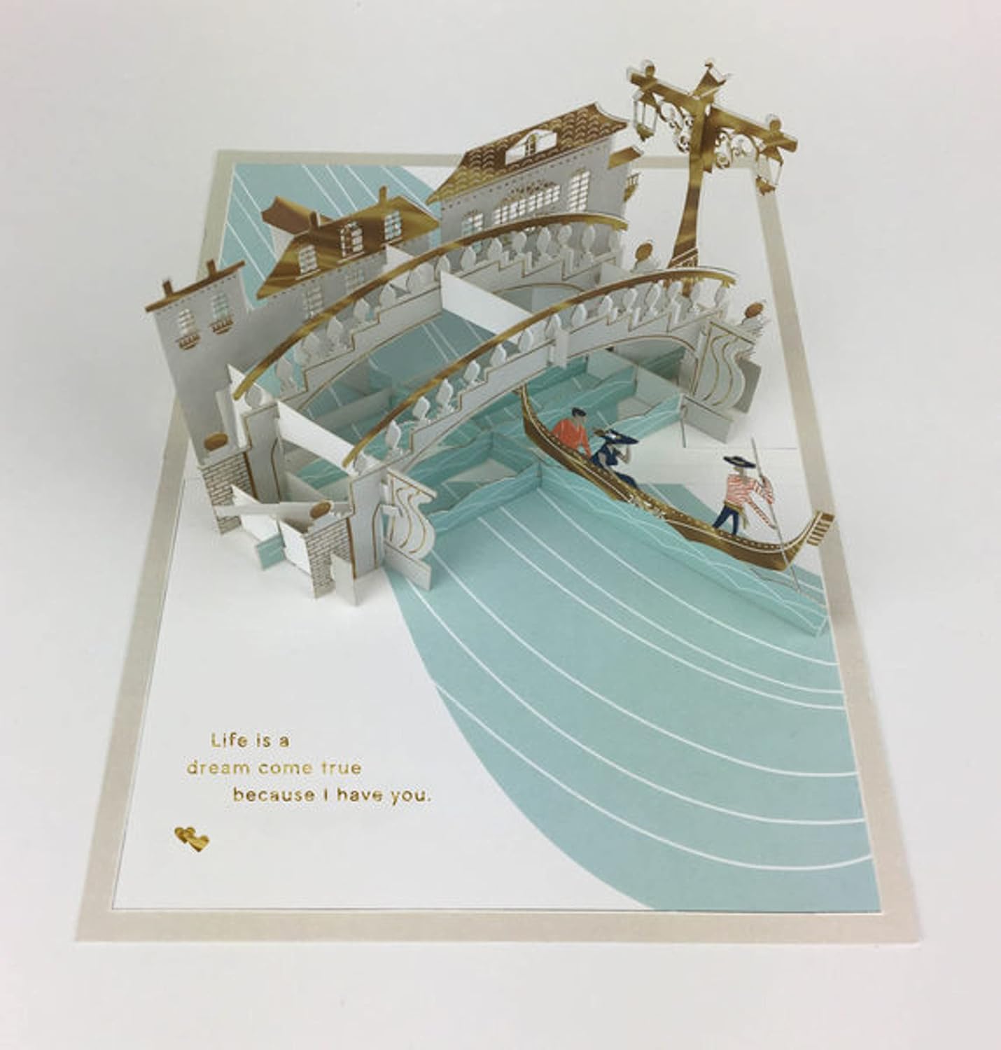 Striped cover features a gold foil border and "I love you" lettering. Inside features an elaborate surprise pop-up of a couple passing under a bridge on a romantic gondola ride, and the message: "Life is a dream come true because I have you."
