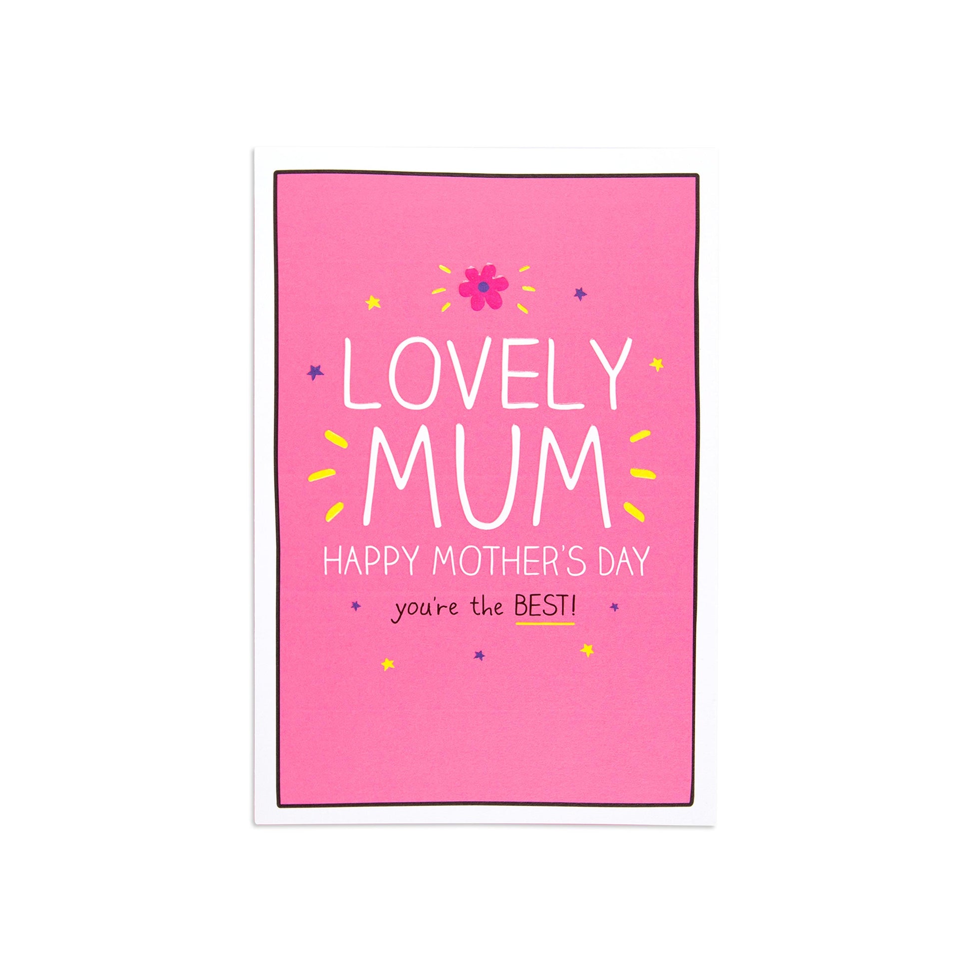 The front of the card features debossed detailing and illustrations of stars and a flower alongside the message “LOVELY MUM HAPPY MOTHER’S DAY you’re the BEST!”