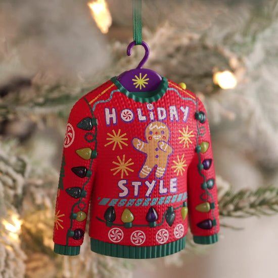 Dress your tree in style this holiday season with this fun Christmas tree ornament. Taking the ugly Christmas sweater trend to fashionable new heights, this festive decoration features a red and green knit beauty loaded with holiday icons including a cheerful gingerbread man, peppermint candies and string lights. Press the button to see it light up and hear a fun version of "Carol of the Bells." Battery operated.