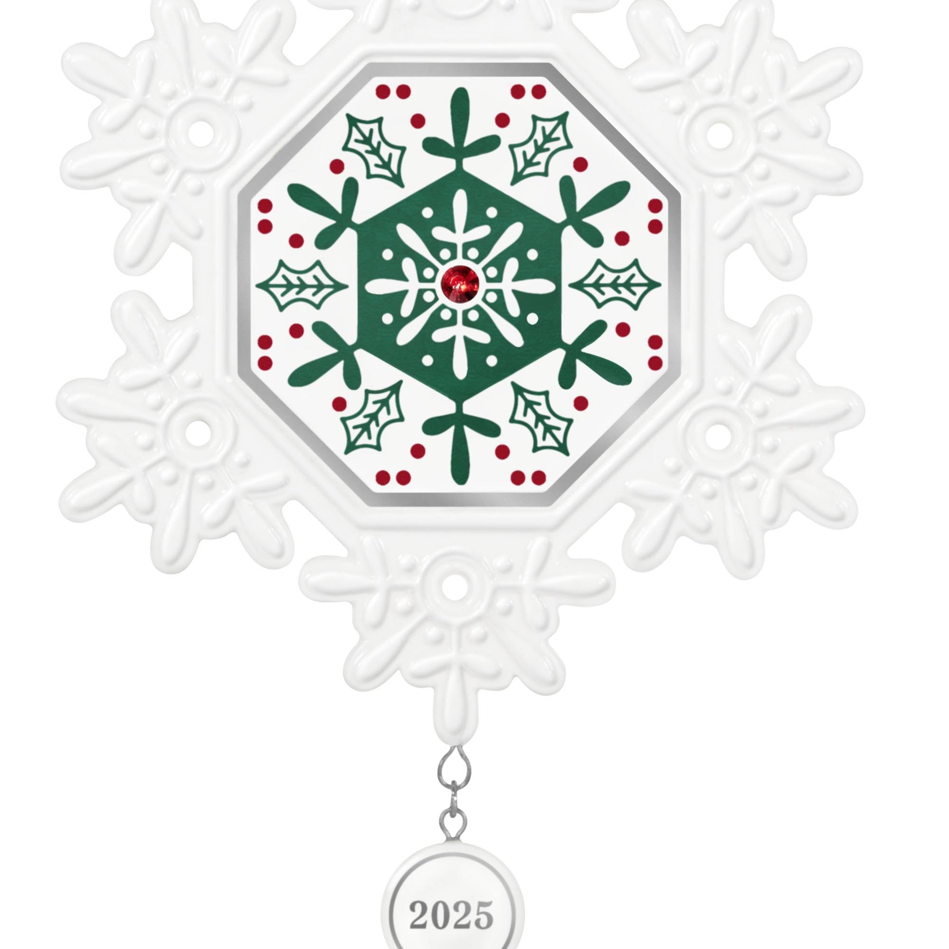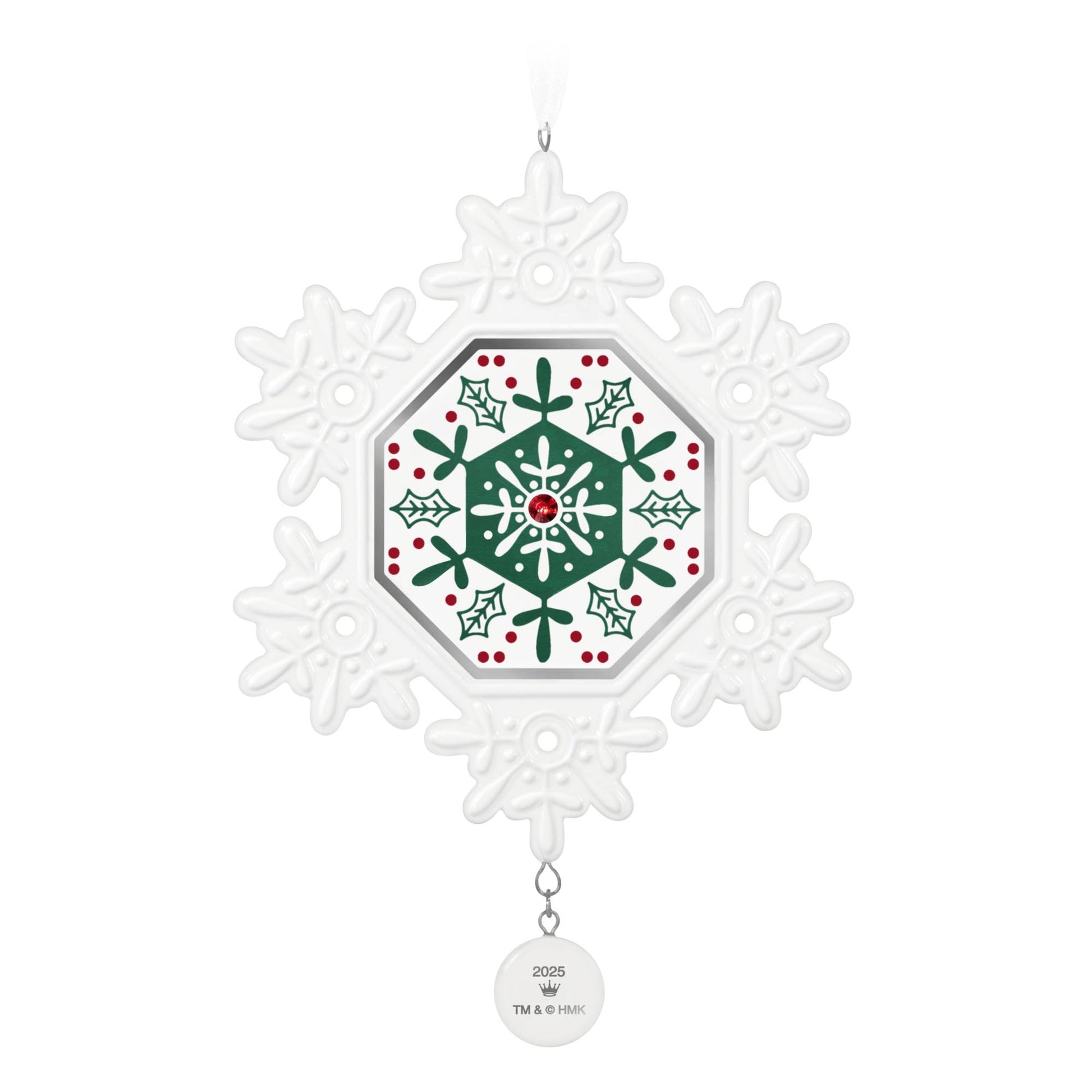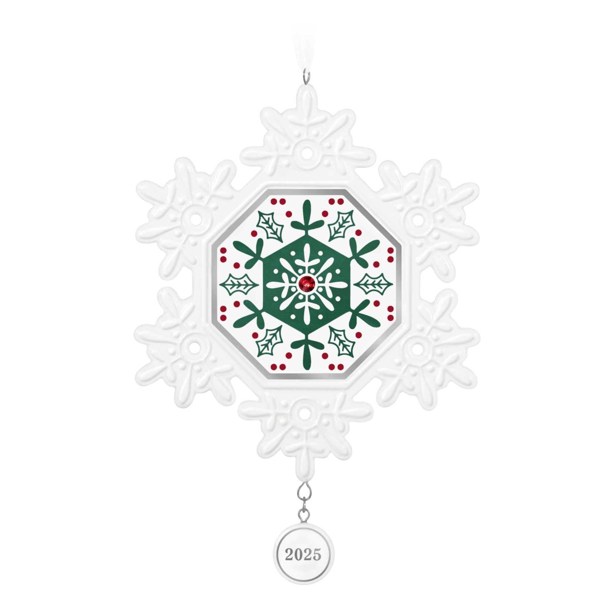 Commemorate 2025 with this elegant snowflake Christmas tree ornament. Red and green painted accents and a shimmery red gemstone embellish the classic white design, drawing the eye to its exquisitely detailed craftsmanship. This beautiful porcelain decoration with a year-dated charm makes a lovely addition to your holiday festivities. With unparalleled artistry and exceptional detail, Hallmark Keepsake Christmas ornaments are perfect for preserving precious memories, commemorating special milestones and celebrating individual hobbies and interests.