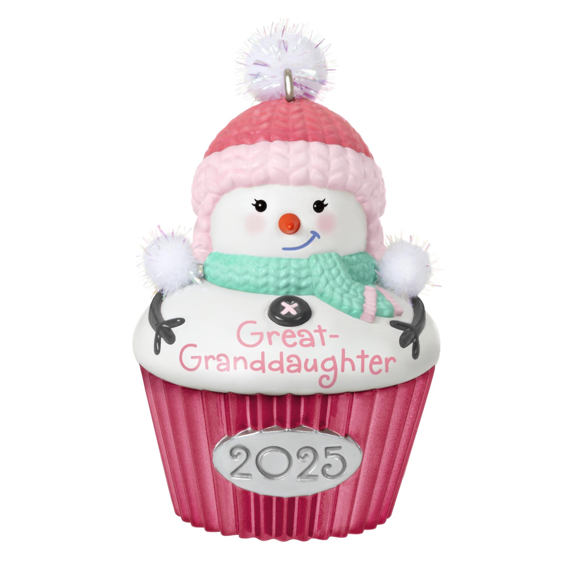 Sweeten the holidays for a special great-granddaughter with this whimsical Christmas tree ornament. The year-dated decoration features a smiling snow-girl, bundled up in a green scarf and pink hat with pom-pom attachments, that looks like a tasty cupcake. With unparalleled artistry and exceptional detail, Hallmark Keepsake Christmas ornaments are perfect for preserving precious memories, commemorating special milestones and celebrating individual hobbies and interests.