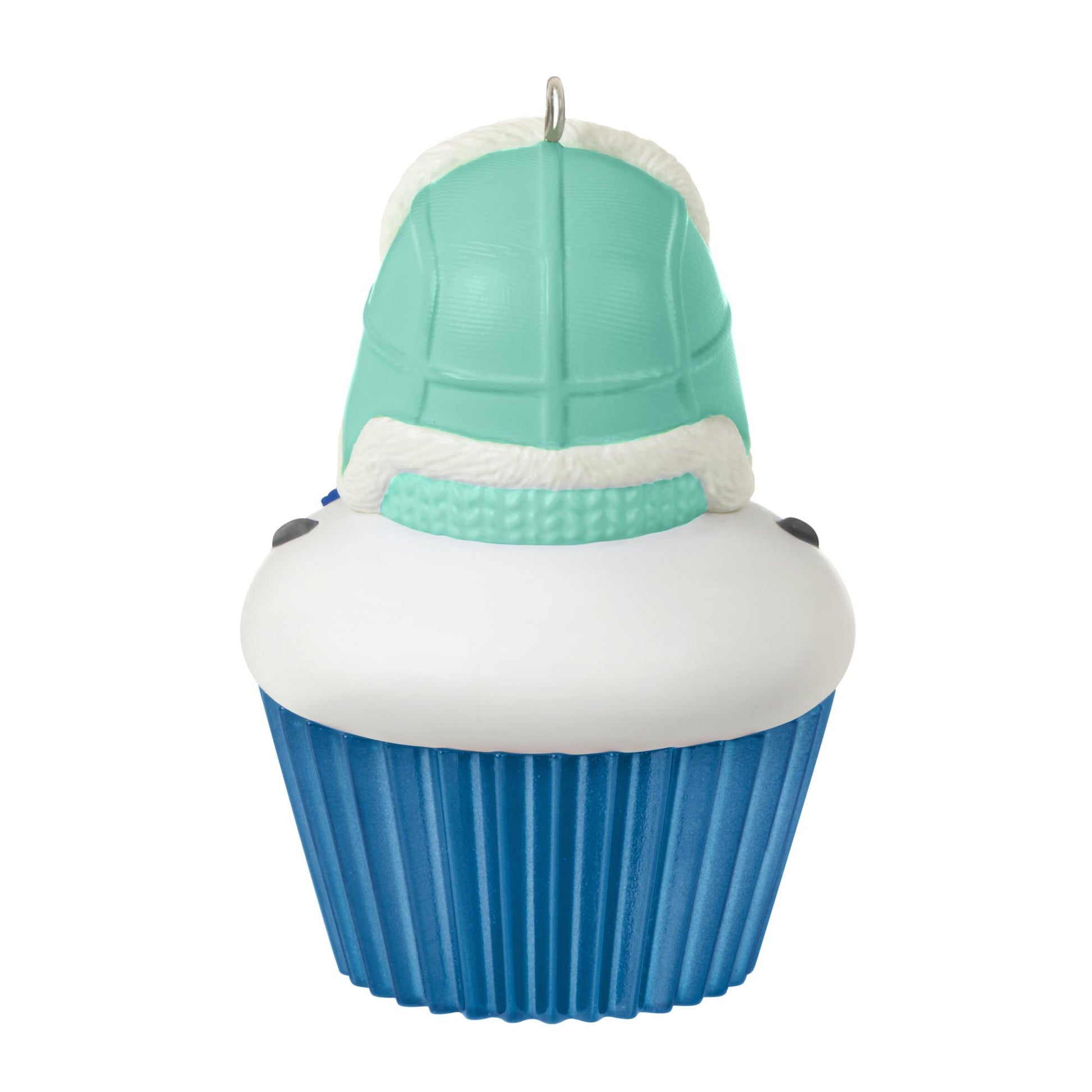 - Year-dated decoration features a smiling snow-boy that looks like a cupcake.