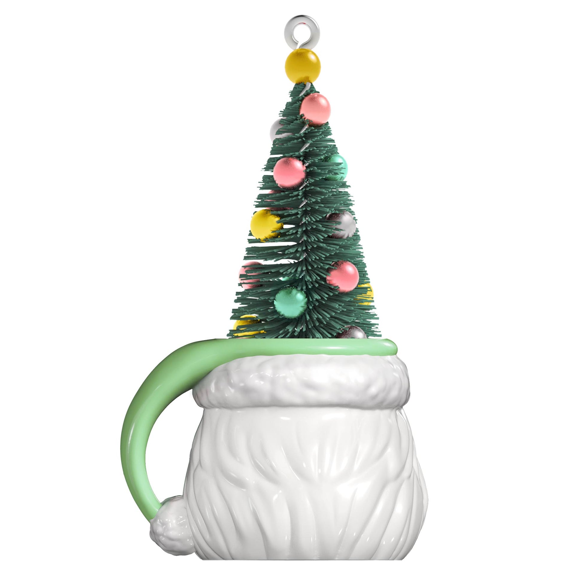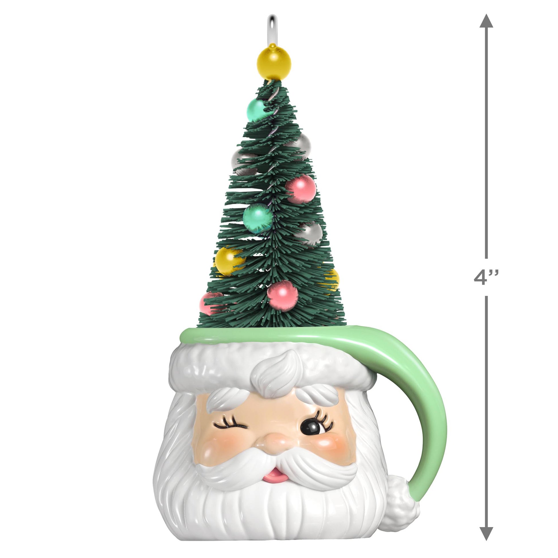 Give a nod to Christmas past with this charming decoration that will delight for many years to come, too. Retro styling lends warm nostalgia to this Christmas tree ornament featuring a winking Santa face sculpted as a mug with a green stocking hat handle and filled with a pretty bottlebrush tree adorned with pastel ball ornaments. With unparalleled artistry and exceptional detail, Hallmark Keepsake Christmas ornaments are perfect for preserving precious memories, commemorating special milestones and celebrating individual hobbies and interests.