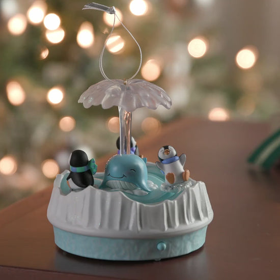 - Get ready for wintry fun with this Playful Penguins Hallmark Keepsake Christmas ornament. Lights up and plays music as three penguins ride on ice platforms around a whale. Battery operated.