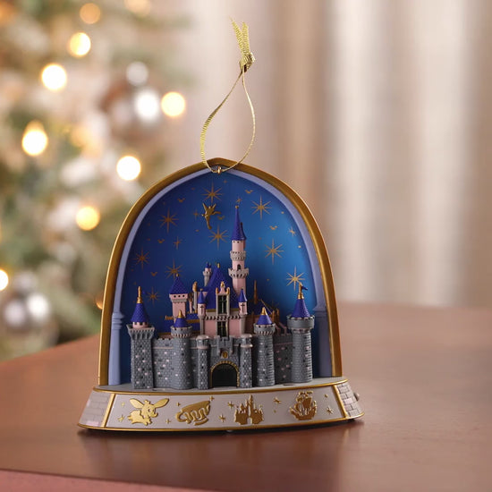 Commemorate the 70 years of The Happiest Place on Earth with this stunning Christmas tree ornament. The Disneyland design features Sleeping Beauty's Castle with an iridescent finish in honor of the theme park's platinum anniversary. Press the button to see a beautiful light show with fireworks as music from "When You Wish Upon a Star" plays. Battery operated.