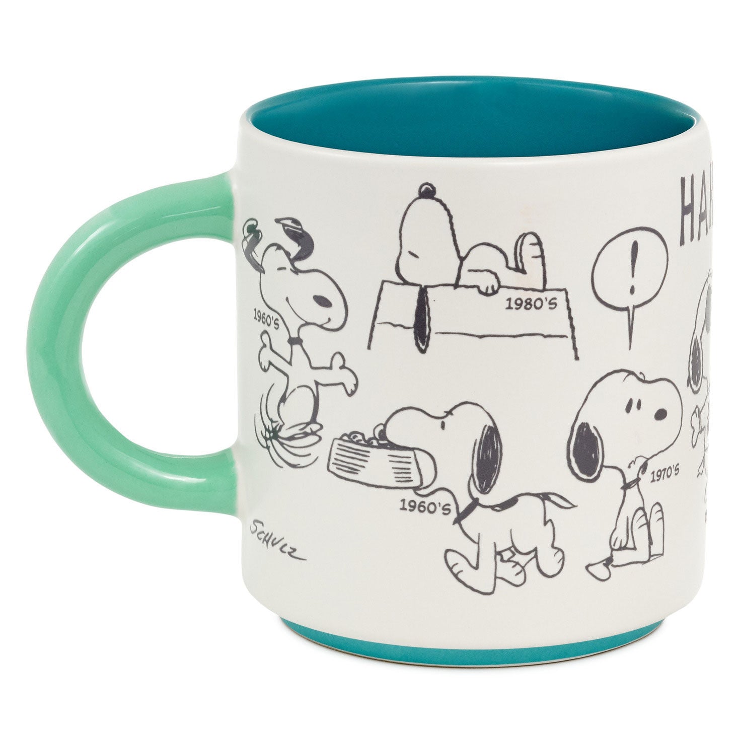 - Peanuts ceramic mug with glazed blue interior and green handle features gray year-dated drawings of Snoopy.