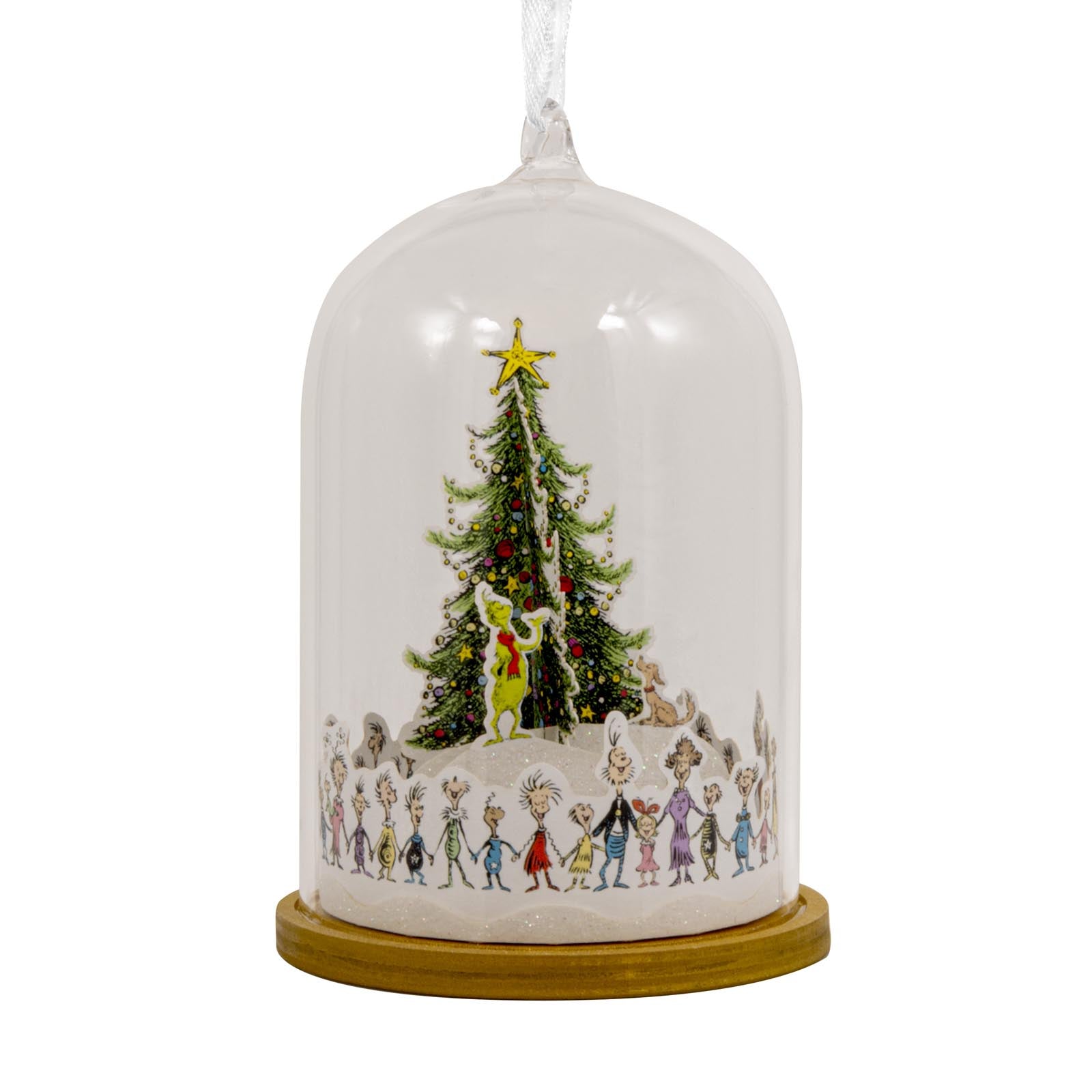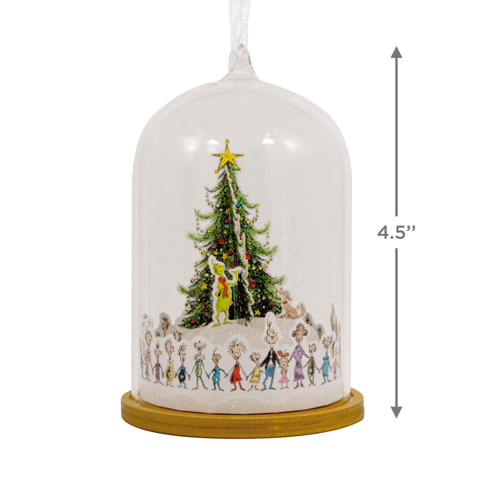 Add a festive and fun touch to your holiday decor with this beautiful glass cloche Christmas tree ornament that's perfect for Dr. Seuss "How the Grinch Stole Christmas!" fans. An intricate papercraft scene featuring the Grinch and all the residents of Whoville gathered around the tall, festive Christmas tree in the town square is showcased inside the glass cloche.