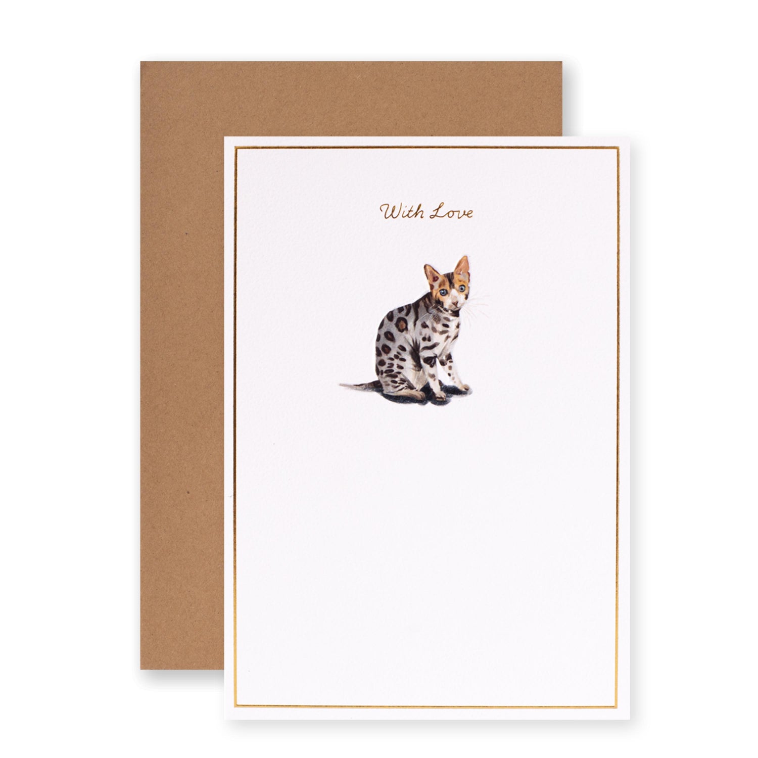 The front of the card features textured paper, gold foil highlights, embossed elements, an illustration of a Bengal cat, and the message “With Love” Blank inside for your own message Includes one card and one coordinating Hallmark branded kraft envelope Care for your people. Care for your planet. This product is made of material from well-managed, FSC®-certified forests and other controlled sources and is 100% recyclable.