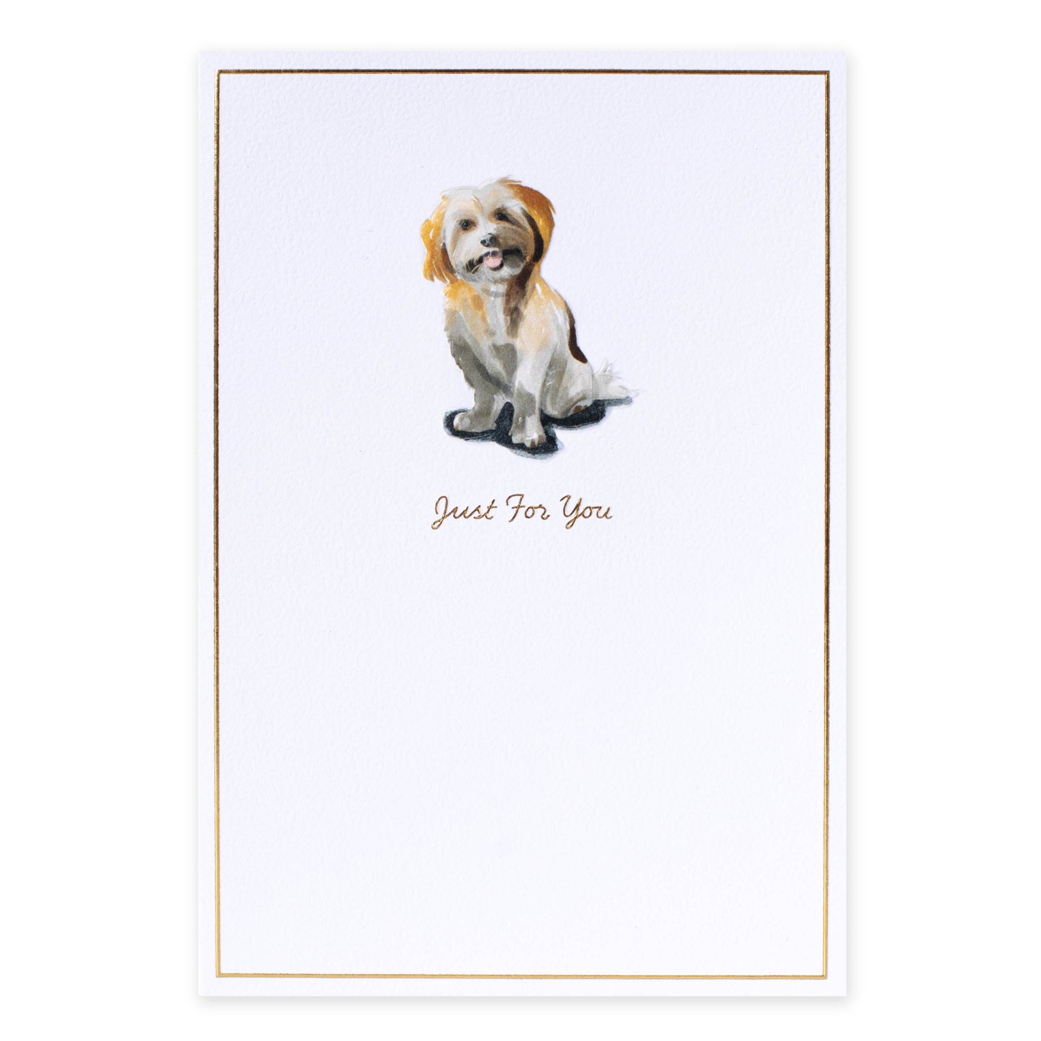 The front of the card features linen textured stock, gold foil highlights, embossed elements, an illustration of a Cavoodle, and the message “Just For You” Blank inside for your own message Includes one card and one coordinating Hallmark branded kraft envelope Care for your people. Care for your planet. This product is made of material from well-managed, FSC®-certified forests and other controlled sources and is 100% recyclable.