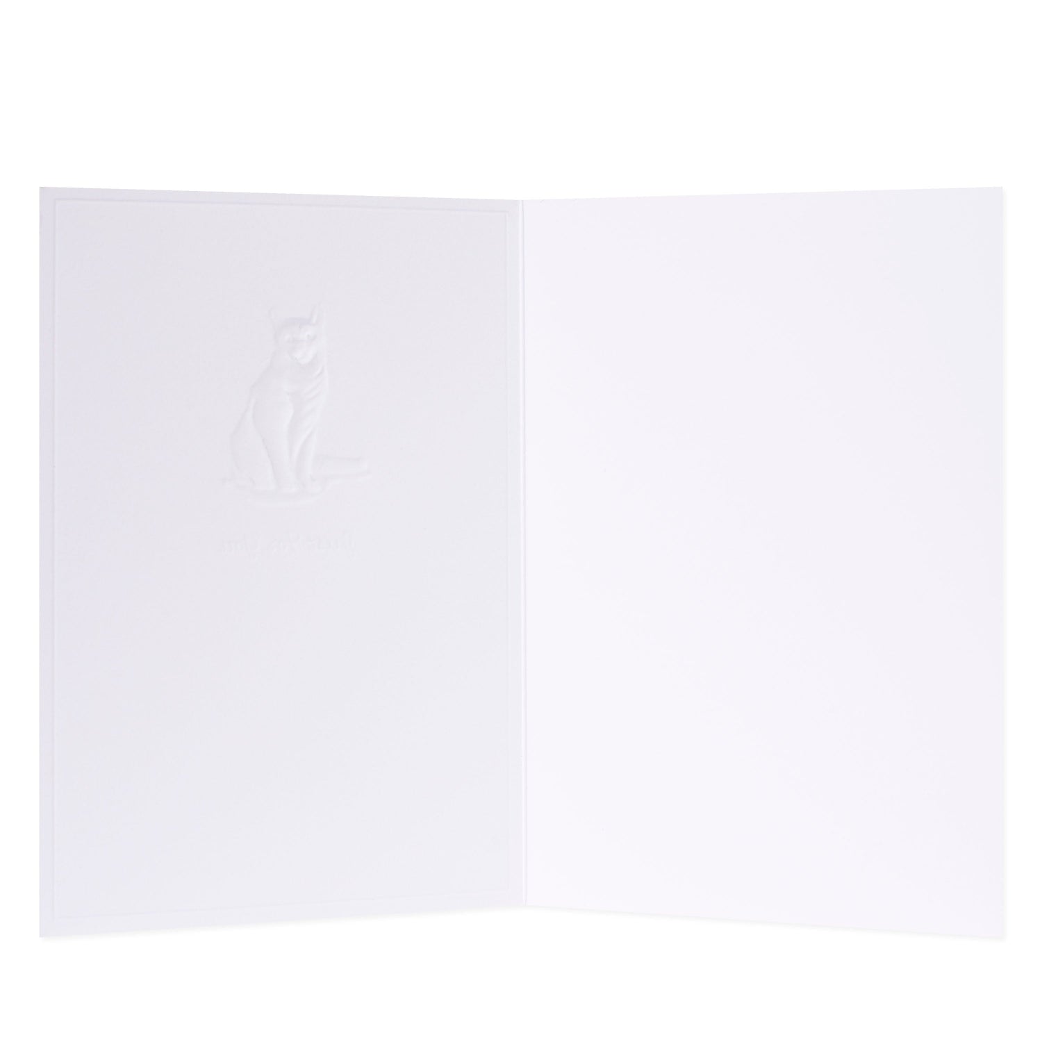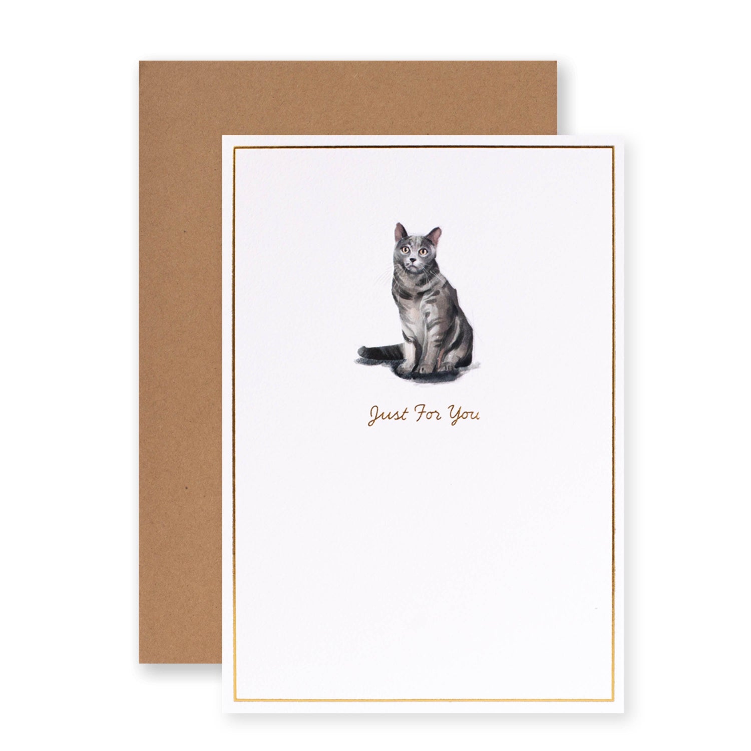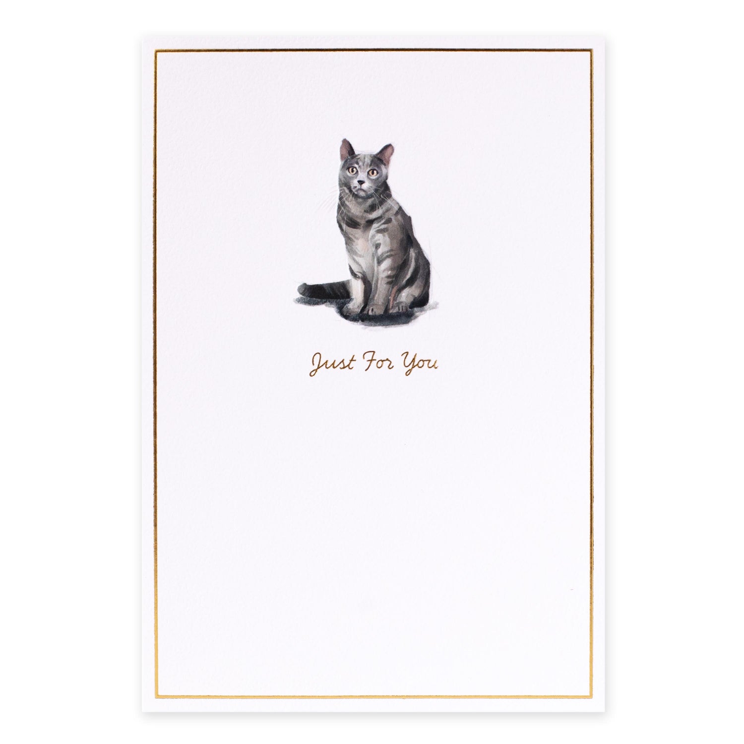 The front of the card features textured paper, gold foil highlights, embossed elements, an illustration of shorthair cat, and the message “Just For You” Blank inside for your own message Includes one card and one coordinating Hallmark branded kraft envelope Care for your people. Care for your planet. This product is made of material from well-managed, FSC®-certified forests and other controlled sources and is 100% recyclable.