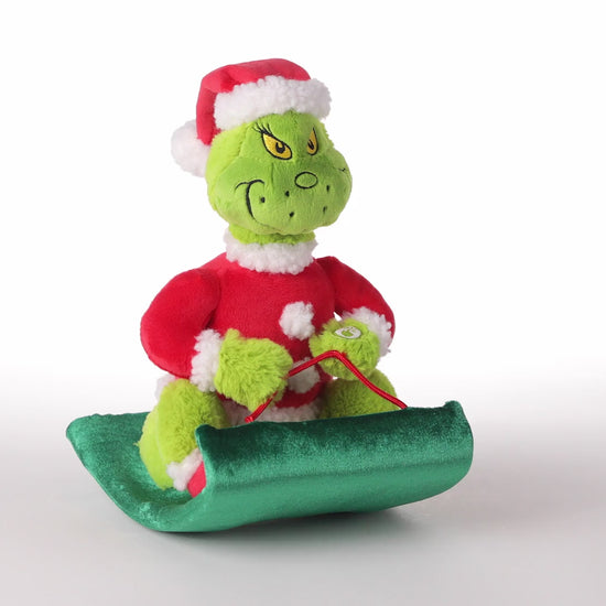 Cruise through the holidays in fun style with this adorably grouchy plush Grinch character. Dr. Seuss's Grinch musical stuffed animal is dressed in a Santa suit and sits on a sled. Press the button on his hand to see him rock back and forth on his sled to the song "You're a Mean One, Mr. Grinch." Sledding Grinch plush makes a hilarious gift for a holiday party hostess or Grinch fan.