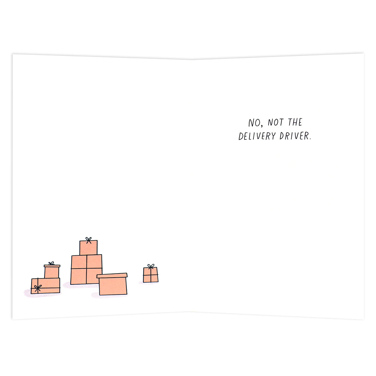 The front of the card features an illustration of a raccoon wearing a party hat alongside the message “HAPPY BIRTHDAY FROM ONE OF YOUR FAVOURITE PEOPLE!” The inside of the card features illustrations of gifts alongside the message “NO, NOT THE DELIVERY DRIVER.” Includes one card and one coordinating Hallmark branded yellow envelope Care for your people. Care for your planet. This product is made of material from well-managed, FSC®-certified forests and other controlled sources and is 100% recyclable.