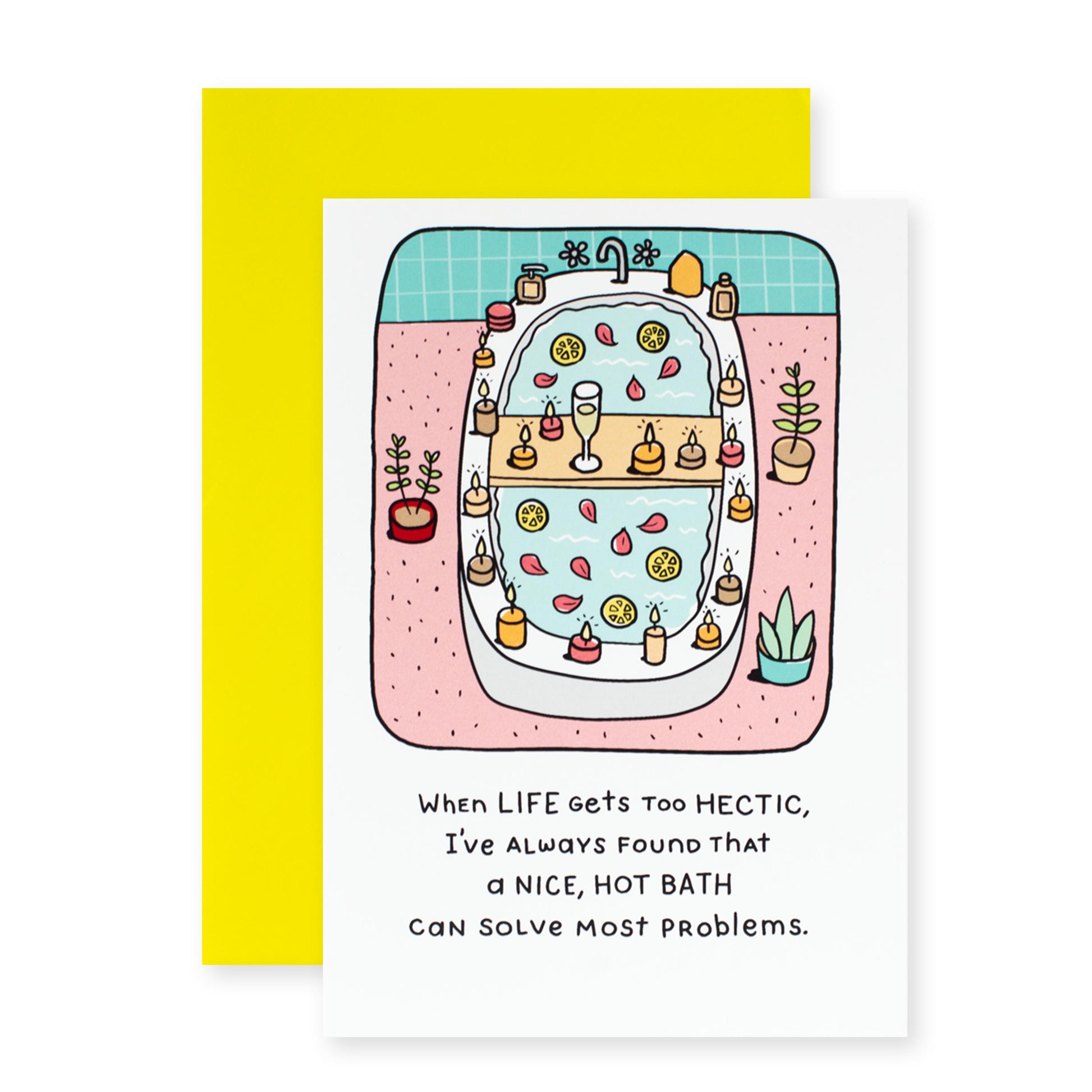 The front of the card features an illustration of a bathtub surrounded by candles and plants alongside the message “When LIFE gets too HECTIC, I’ve always found that a NICE, HOT BATH can solve most problems.” The inside of the card features an illustration of a bathtub with a straw poking through for air alongside the message “I’ve been in here since last THURSDAY.” Includes one card and one coordinating Hallmark branded yellow envelope Care for your people. Care for your planet. This product is made of material from well-managed, FSC®-certified forests and other controlled sources and is 100% recyclable.