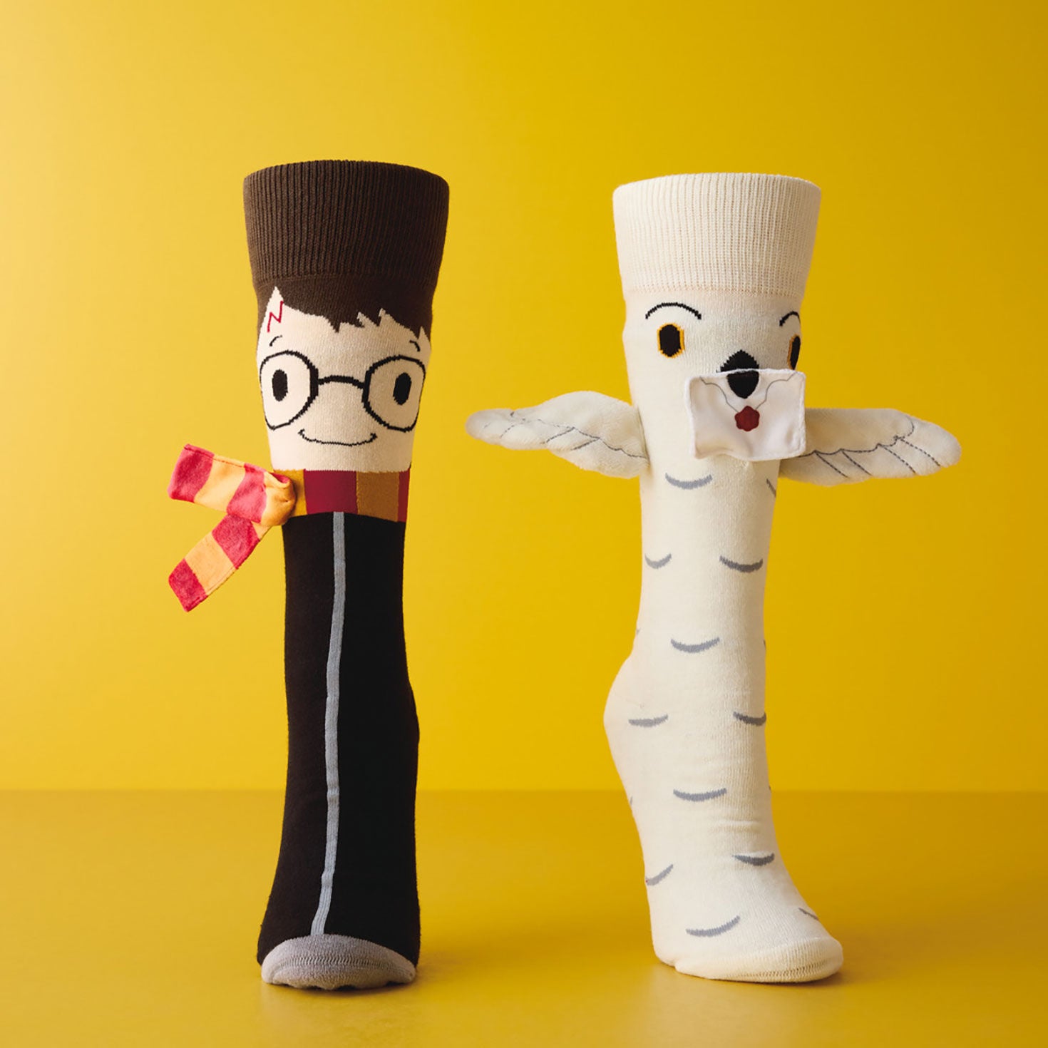 - Harry Potter mismatched crew socks feature Harry Potter and Hedwig designs with fabric attachments.