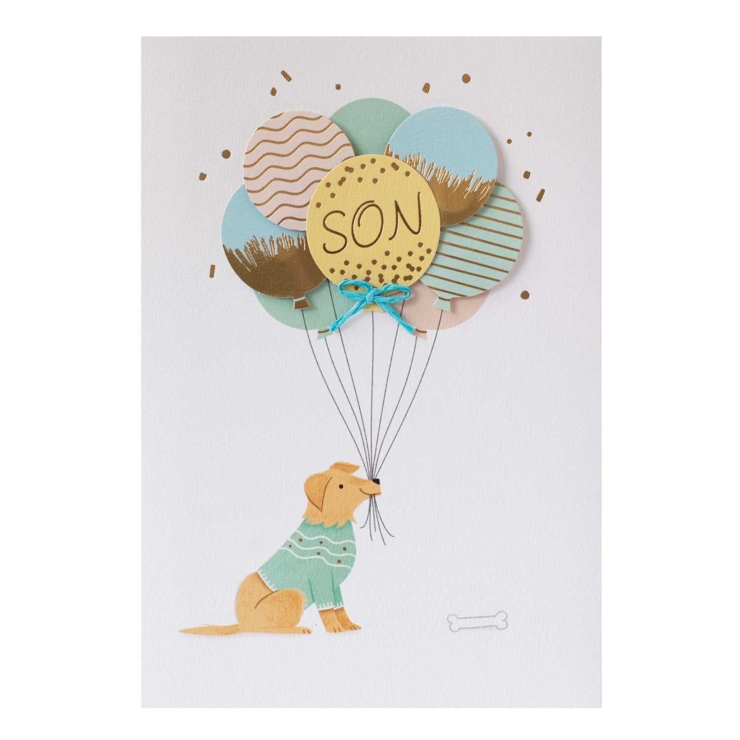 The front of the card features gold foil highlights, 3D plaque attachments, an illustration of a dog with his bone holding a bouquet of colourful balloons, and the message “SON” The inside of the card features gold foil highlights, illustrations of confetti, and the message “HAVE THE BEST BIRTHDAY” Includes one card and one coordinating Hallmark Signature branded white envelope with gold foil highlights Care for your people. Care for your planet. This product is made of material from well-managed, FSC®-certified forests and other controlled sources. The card and envelope are 100% recyclable, and the outer packaging is made from biodegradable cellophane.