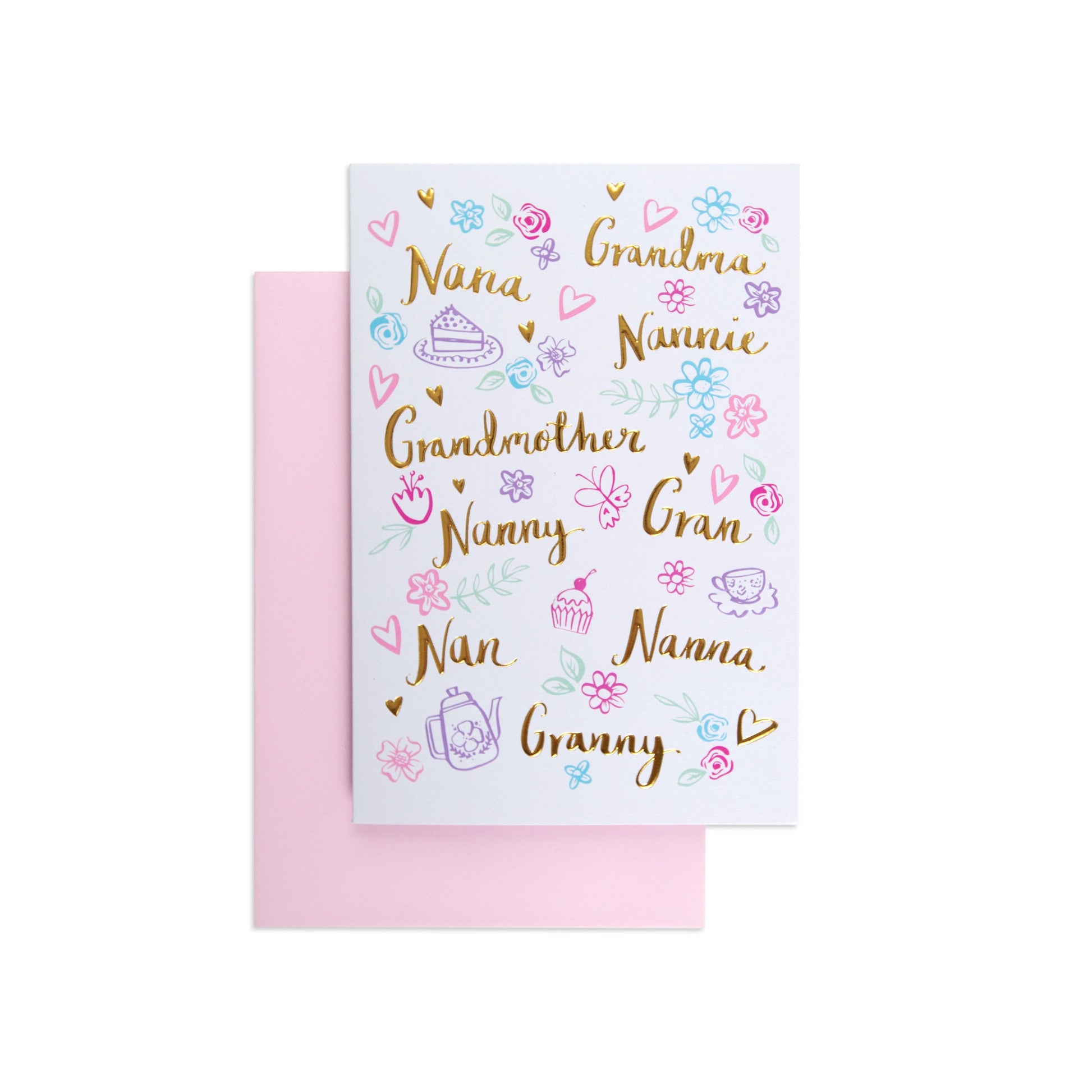Features debossed detailing, gold foil highlights and colourful illustrations of love hearts, cake, tea cups and flowers with the message: “Nana Grandma Nannie Grandmother Gran Nanny Nan Nanna Granny”