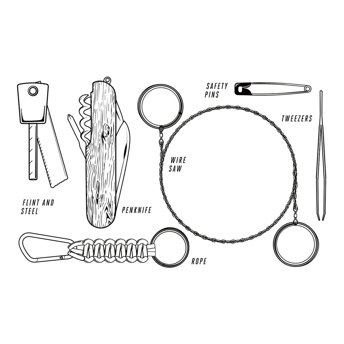 - Includes a fire starter tool, 6-in-1 penknife tool, tweezers, 210cm rope, 10 safety pins and wire saw.