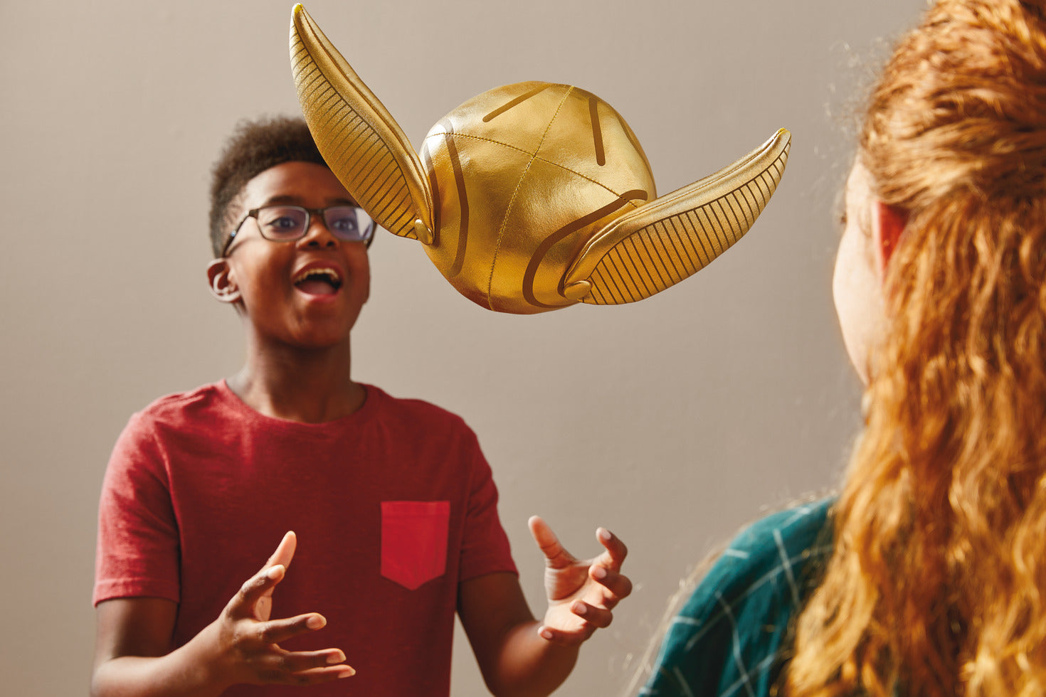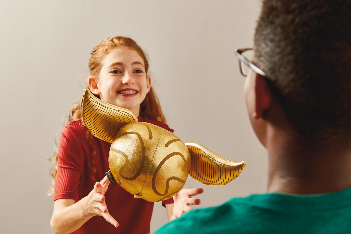 Start a Quidditch game on the ground with this plush Golden Snitch winged ball that's ready to play. The stuffed gold orb vibrates and plays clips of the "Quidditch Theme" from the Harry Potter movies when you toss and catch it. Get up and move between Harry Potter movie-watching or book-reading with this fun Snitch stuffed ball toy that's meant to be played with.
