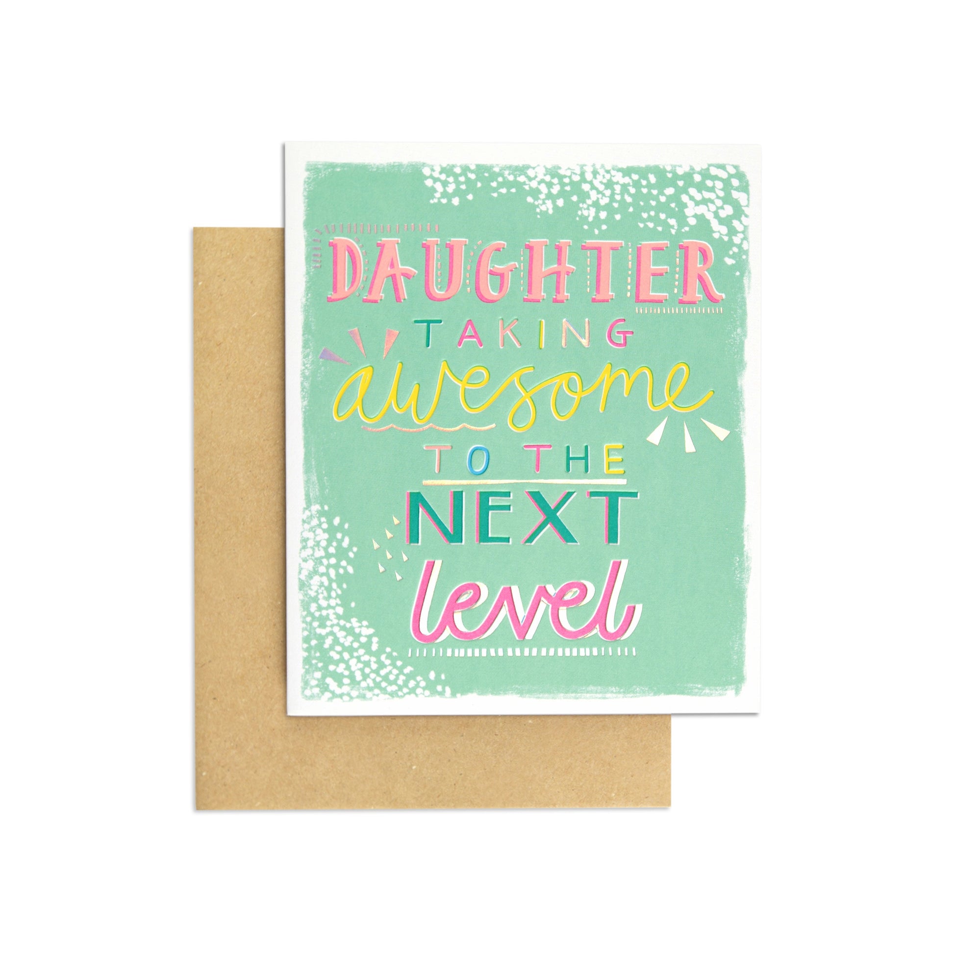 Features bright illustrations with holographic foil details on a mint green background and the mixed font embossed message: “DAUGHTER TAKING awesome TO THE NEXT level”.