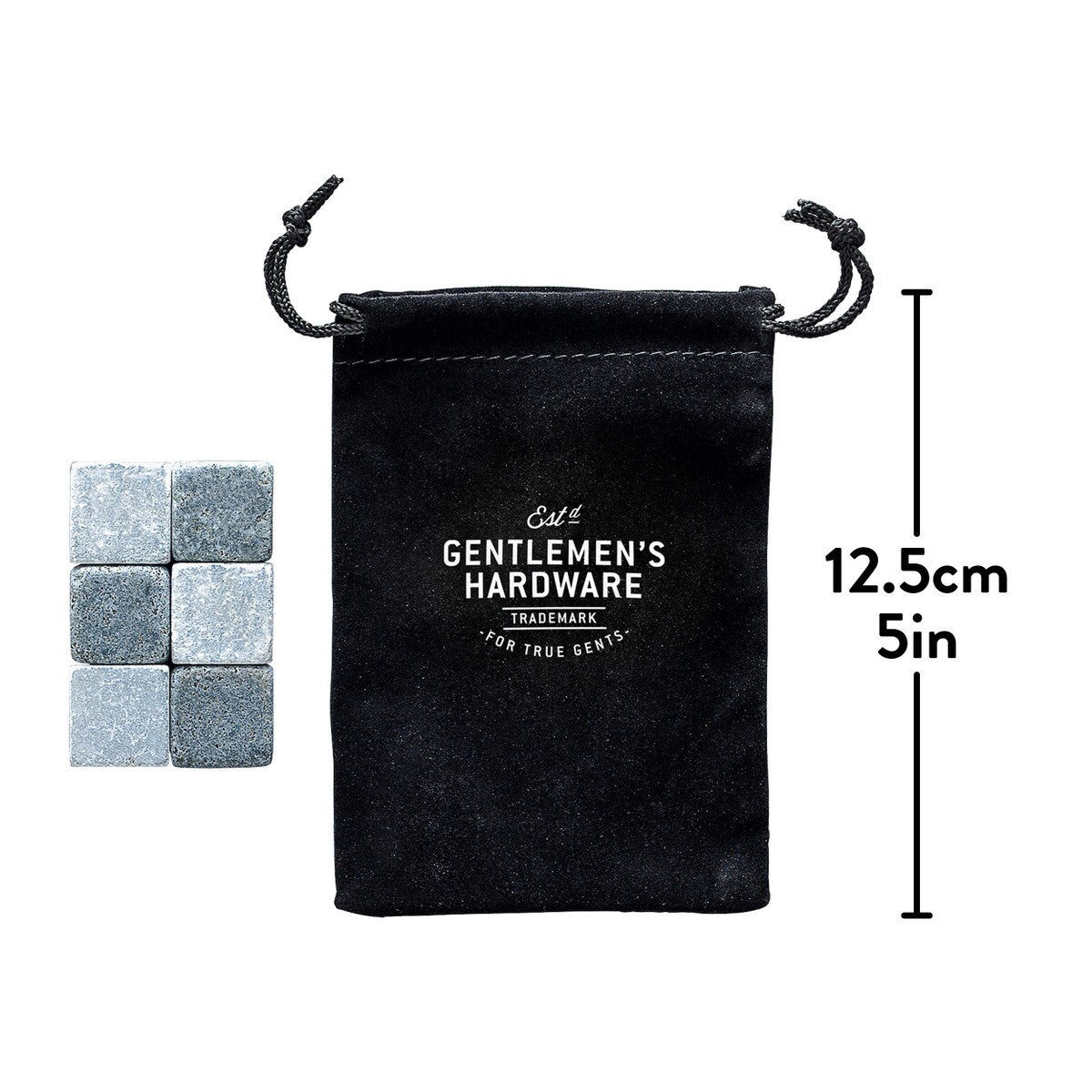 Chill your drink without dilution, the Gentlemen's Hardware Whisky Stones are ideal for any ice cold drink lover. Practical and stylish, the phrase 'on the rocks' is brought to life with this set of six stones made from granite and soapstone. Simply pop in the freezer four hours before use, then when you wish to chill your drink, use as you would ice cubes. An innovative and unique design, ideal for travelling and any ice cold nightcap. Perfection chilled! Hand wash only. Set of 6 individual stones with fabric branded storage pouch.