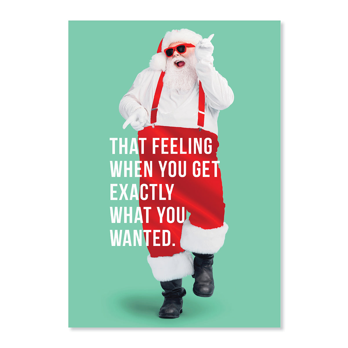 - The front of the card features red foil highlights, a photograph of a cool Santa Claus wearing sunglasses, and the message ‘THAT FEELING WHEN YOU GET EXACTLY WHAT YOU WANTED.’